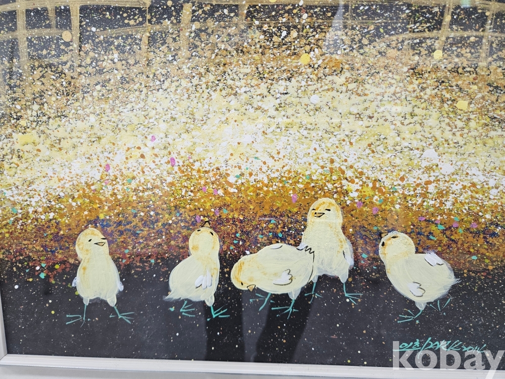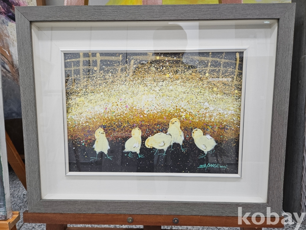 본 작품은 어두운 바탕 위에 여러 마리의 병아리가 나란히 배치된 구상 회화로, 화면 상단에는 점묘에 가까운 밝은 색채가 층을 이루며 퍼져 있다. 반복되는 작은 붓 터치와 색점이 화면 전반에 고르게 구성돼 있으며, 병아리의 형태는 단순화된 윤곽과 밝은 색면으로 표현돼 있다. 전체적으로 안정적인 수평 구도 속에서 색채의 대비와 리듬감이 시각적으로 드러난다.