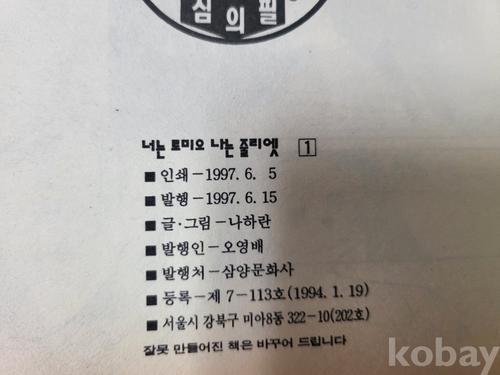 나하란 작품*너는 로미오 나는 줄리엣*1997년6월 초판발행*1권-11권 완결 입니다