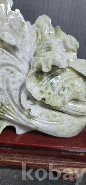 b-91.(대)천연옥으로정교하게깍아만든 배추문양장식품(통나무로깍은좌대포함)