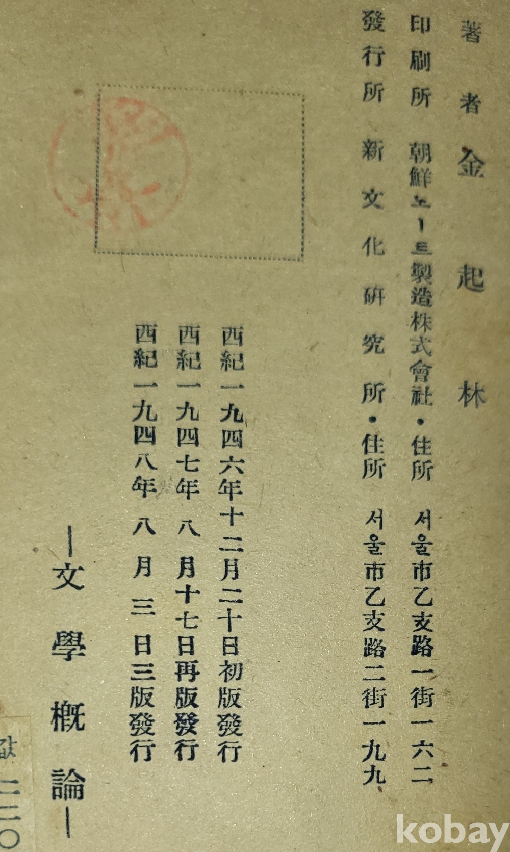 1948년 발행된 김기림(金起林) 저서 문학개론입니다,