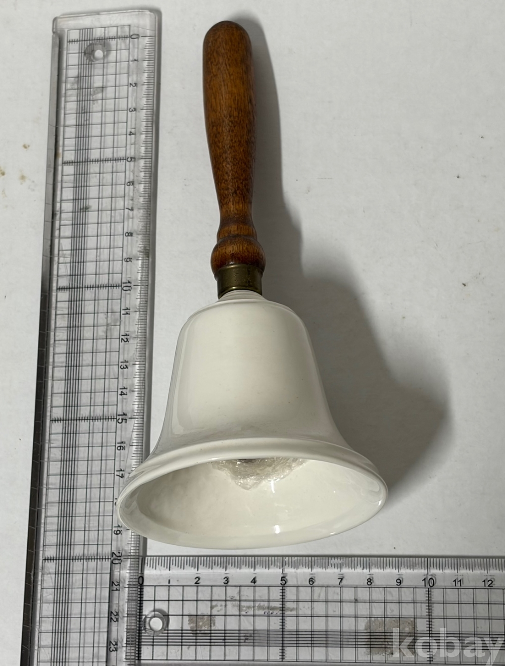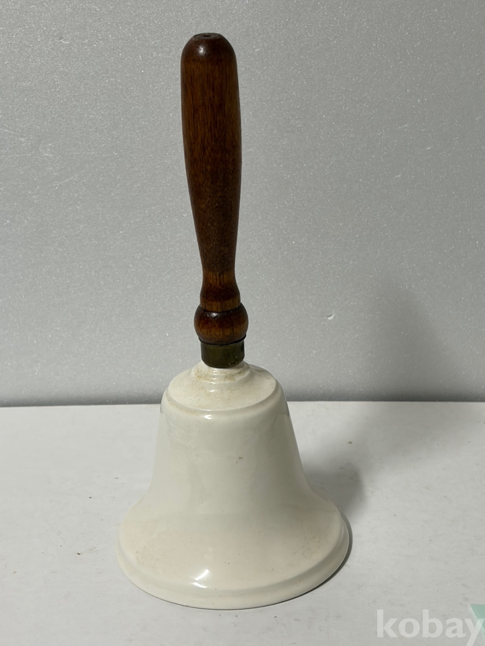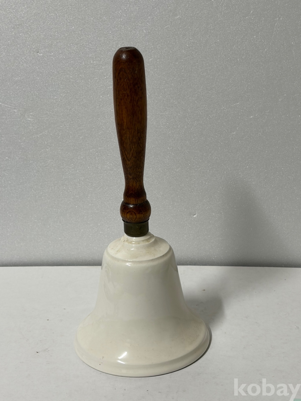 나무 손잡이가 달린 하얀색 도자기 종입니다.