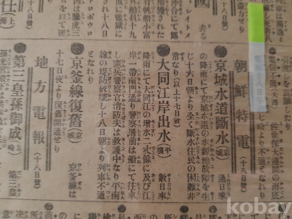 [FF14]*東京日日新聞/1911.7.19./朝鮮特電.京城상수도 斷水,大同江岸出水(평양),