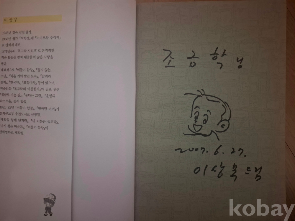 특히 이상무 작가가 친필사인과 주인공 독고탁 그림이 첫 장에 있습니다