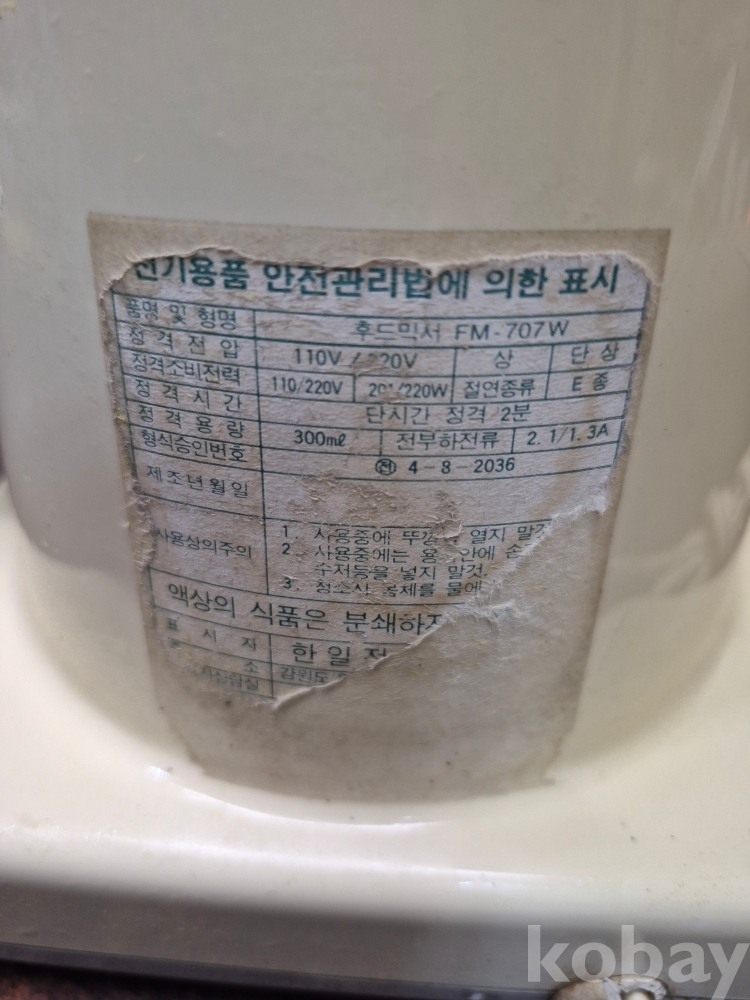 1990년 한일 푸드 믹서기 FM-707W 정상작동 전원 220볼트 15*16*30