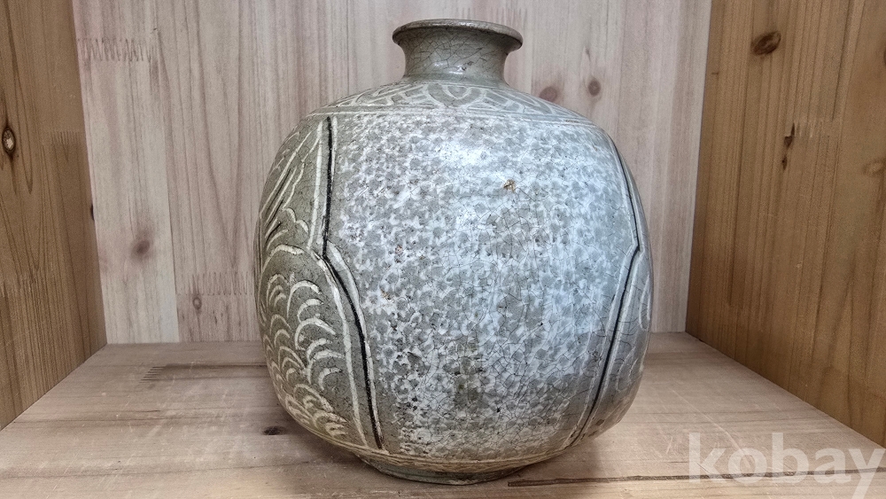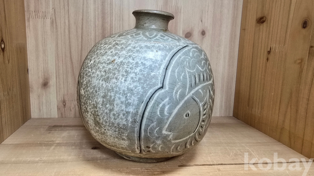 이 기물의 백미는 단연 몸통 중앙을 가득 채운 **커다란 물고기 문양(어문)**입니다. 백토와 자토를 바른 뒤 선을 긁어내어, 물고기의 비늘과 지느러미를 힘차고 생동감 있게 표현했습니다.