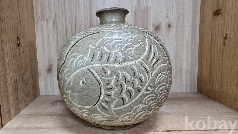 둥글고 납작한 편병의 안정적인 형태와 표면에 자연스럽게 퍼진 자잘한 빙렬(크랙)이 고풍스러운 맛을 더해줍니다. 물고기는 예로부터 '출세'와 '여유', '다산'을 상징하여 풍수 인테리어 소품으로도 인기가 높습니다.