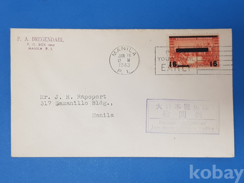 **** 필리핀 마닐라, 일본군 검열 소인분/1943.1.12/우표1매 첩부