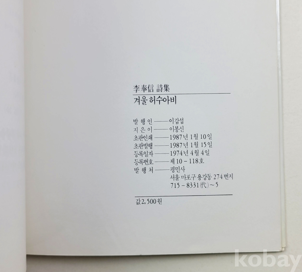물 품 명 | 이봉신 / 겨울 허수아비 / 1987년 초판 / 평민사 |