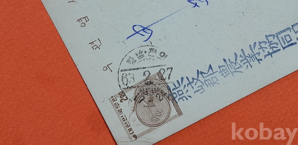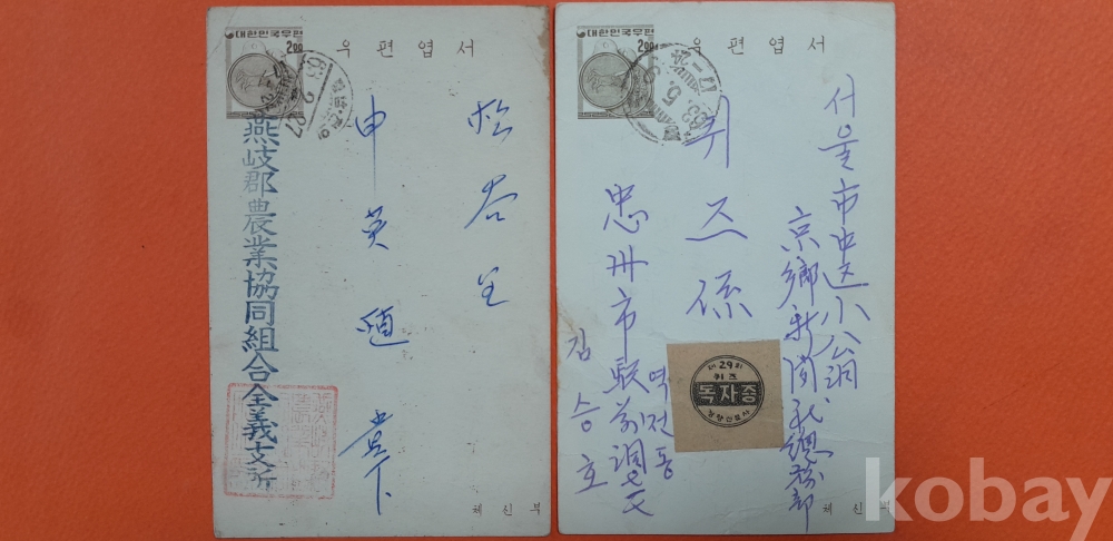 충남 전의 63. 2. 27 소인 등 실체봉피 2종 입니다.