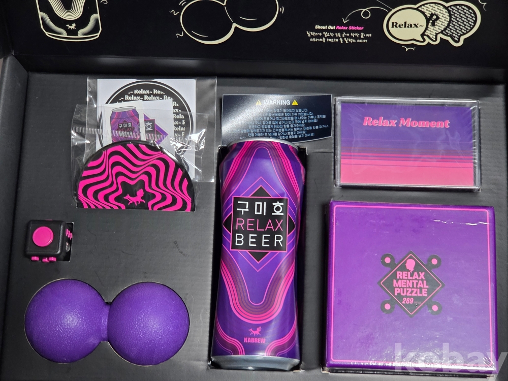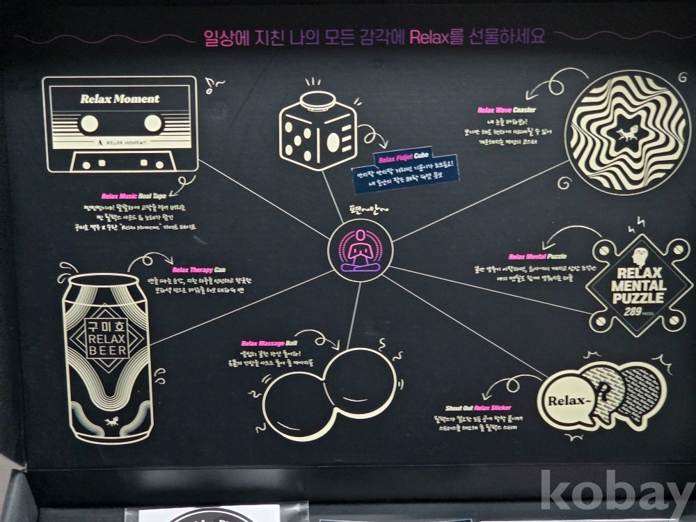 구성품: 카세트 테이프, 릴렉스 테라피 캔, 마사지 볼, 피젯 큐브, 스티커, 퍼즐 등이 포함
