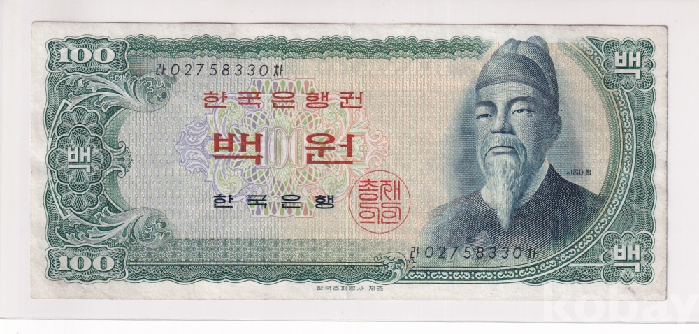 - 한국은행 1965년 세종 백원 줄세우기 02포인트 사용제 지폐