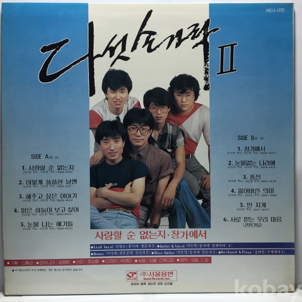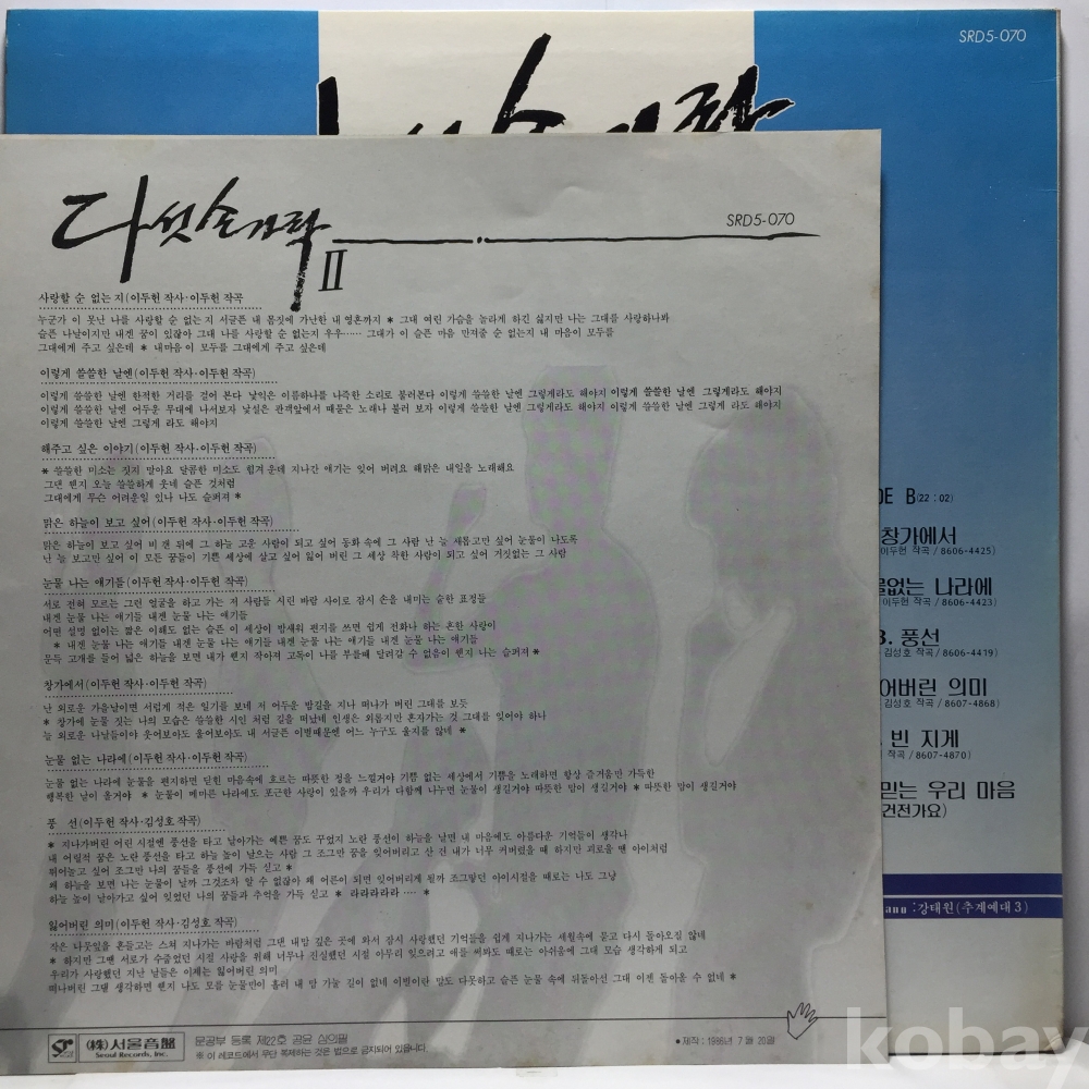 LP 81,800-53 다섯손가락 2집 - 사랑할 순 없는 지/ 풍선 자켓 EX+ 알판 EX+ 86 년 국내반