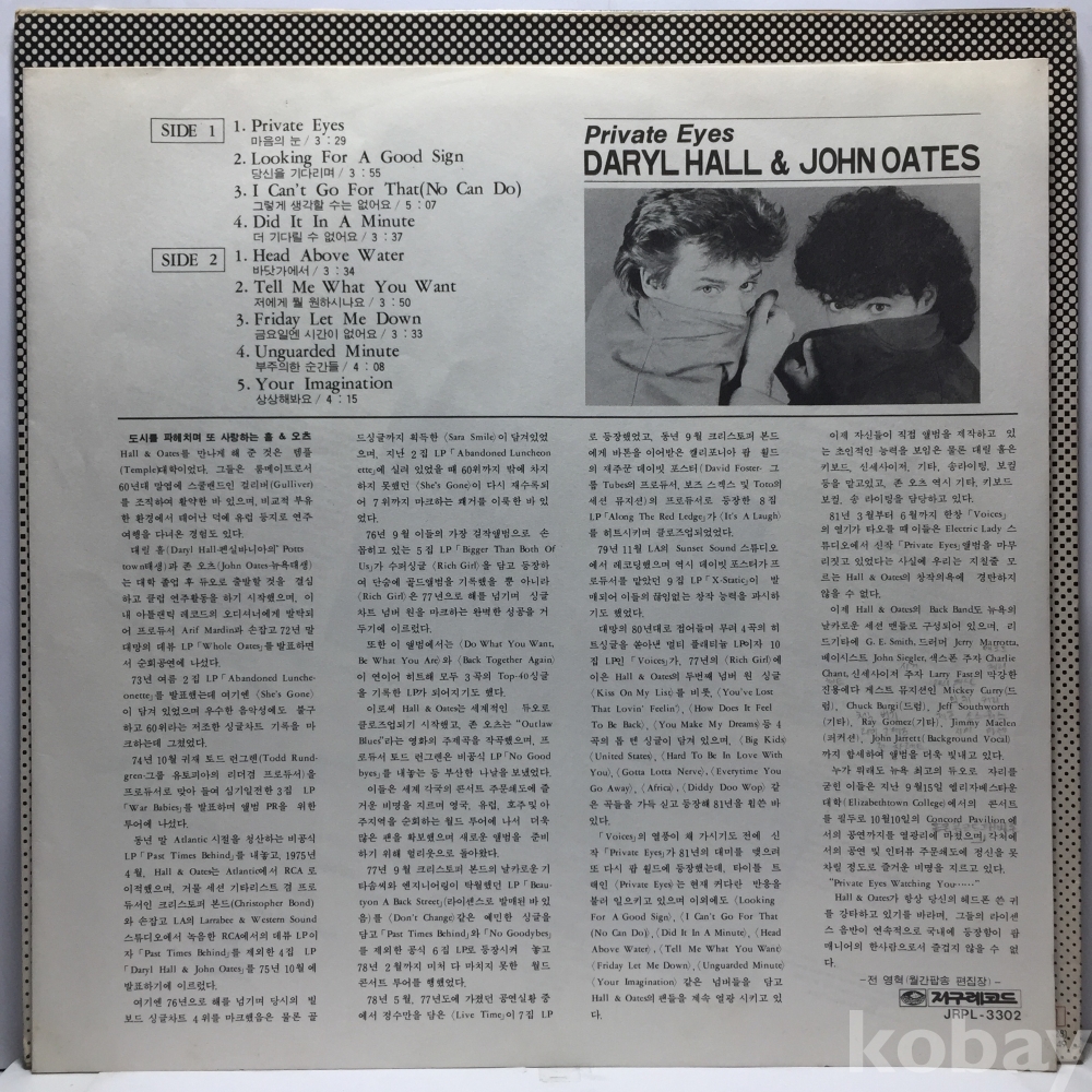 LP 82,000-76 Daryl Hall John Oates - Private Eyes 자켓 EX 알판 EX+ 81 년 국내반