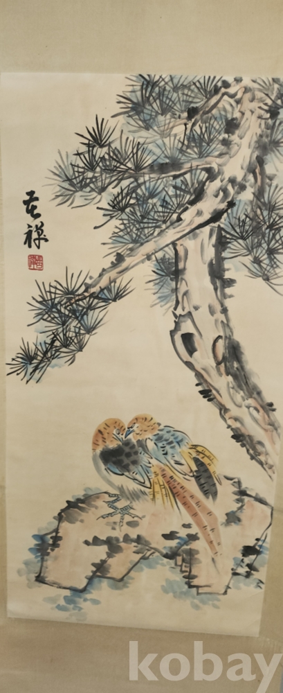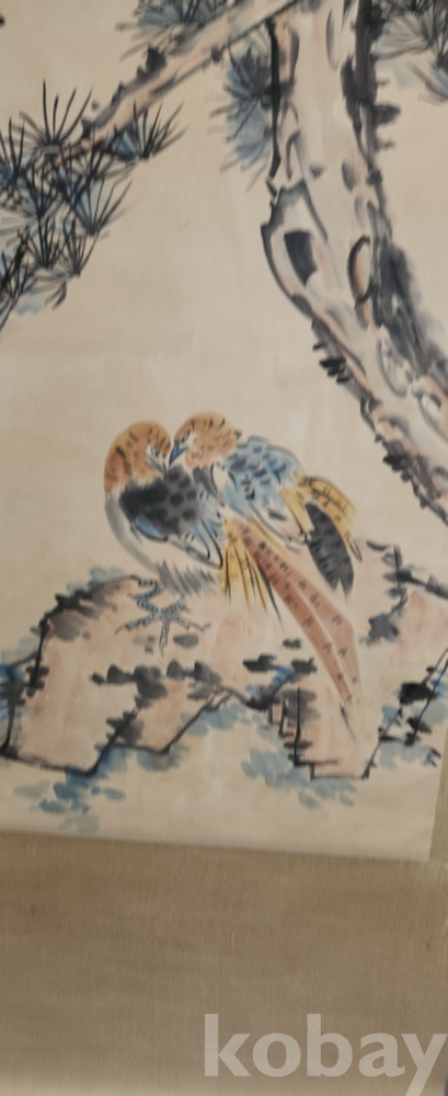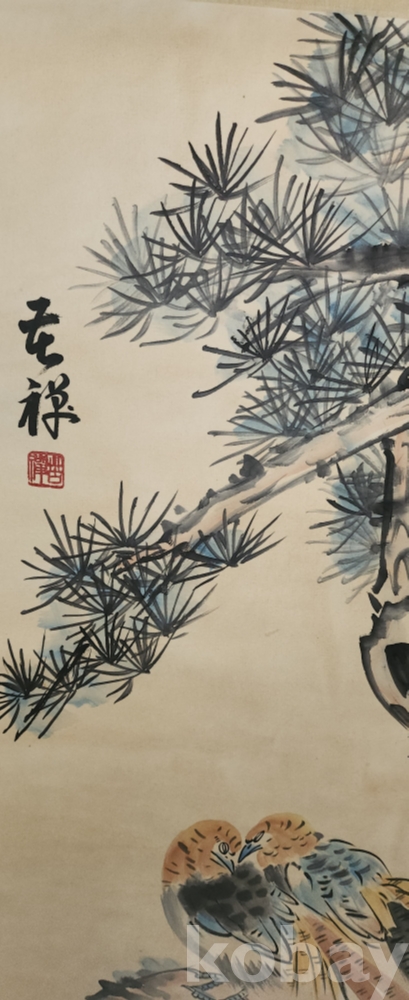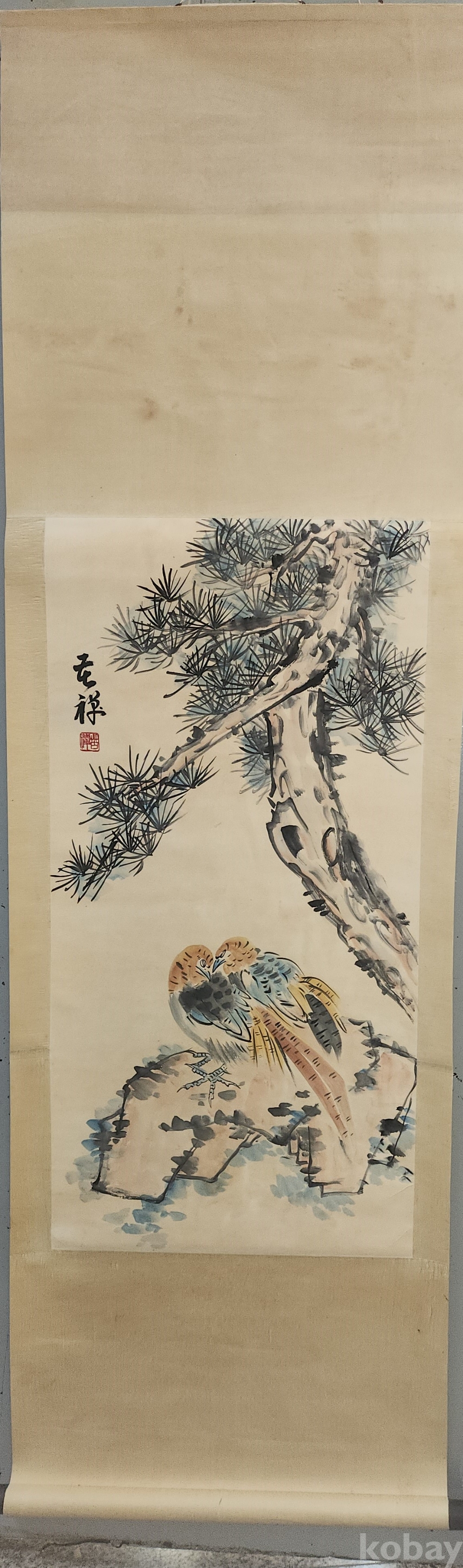 중국화가 고선 수결이 보이는 소나무와 새그림 큰 족자입니다,
