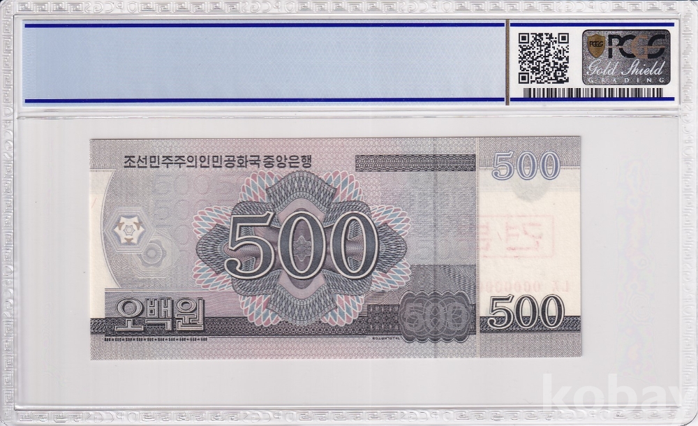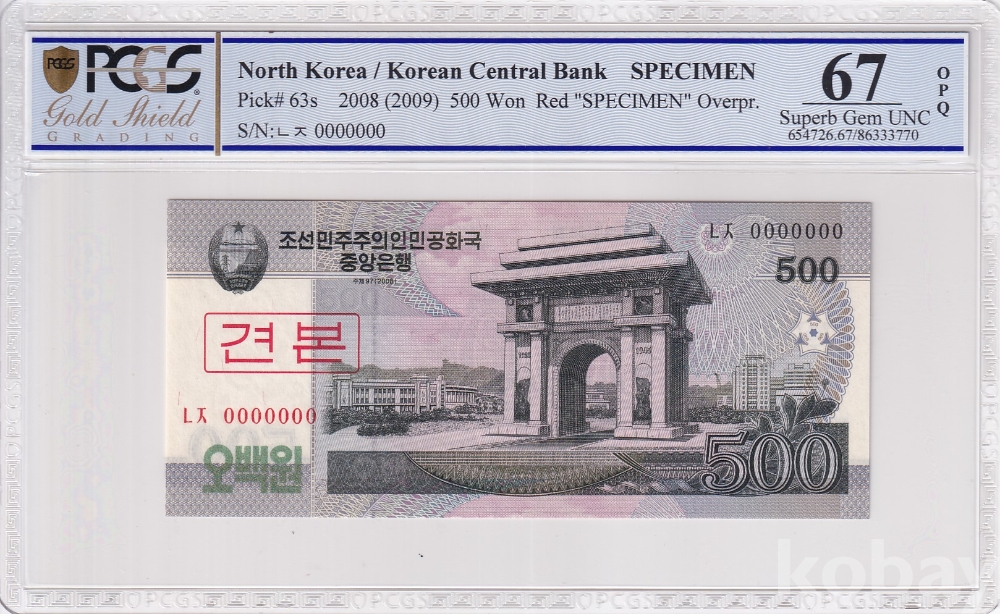 - 윗동네 2008년 500원 견본 PCGS 67 OPQ 인증 지폐