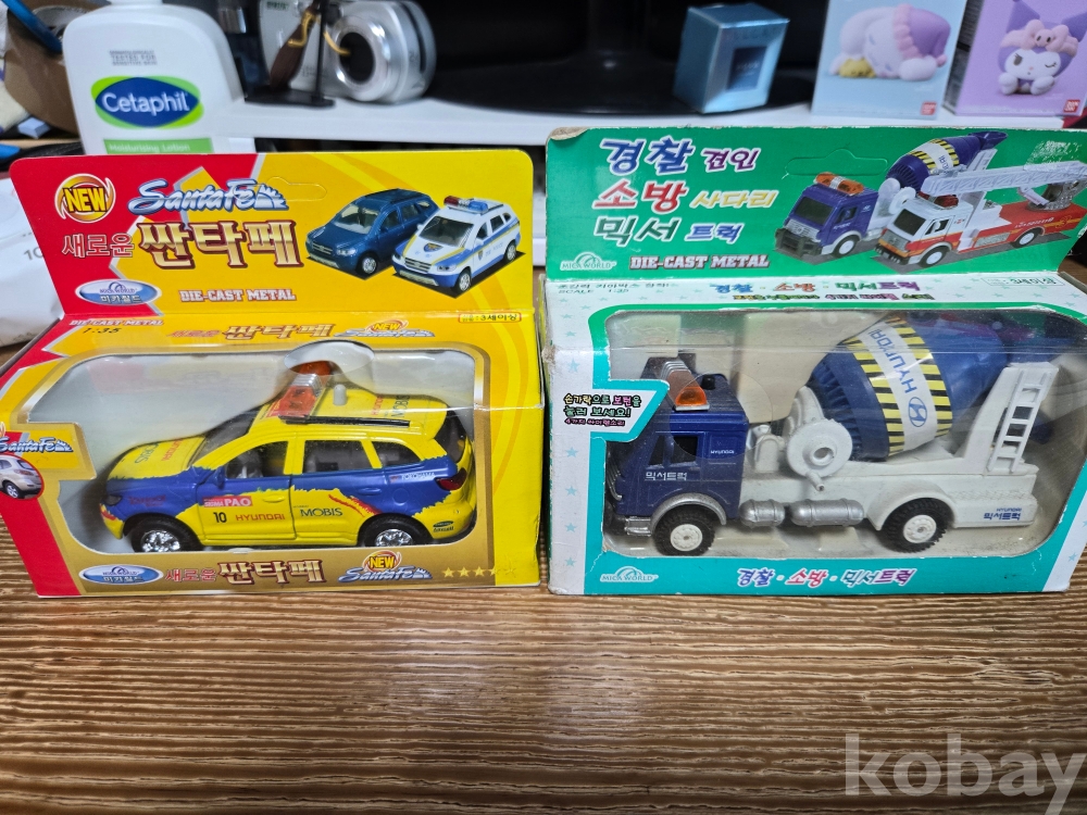 새로운산타페는 미개봉이고 상태는 사진처럼 찍힌곳과 얼룩있습니다. 사이렌 작동안하는걸로 확인되었습니다. 믹서트럭은 개봉해서 확인만한 제품이고 상태 안좋습니다. 사이렌과 불빛은 고장인지 이상한소리가 납니다.