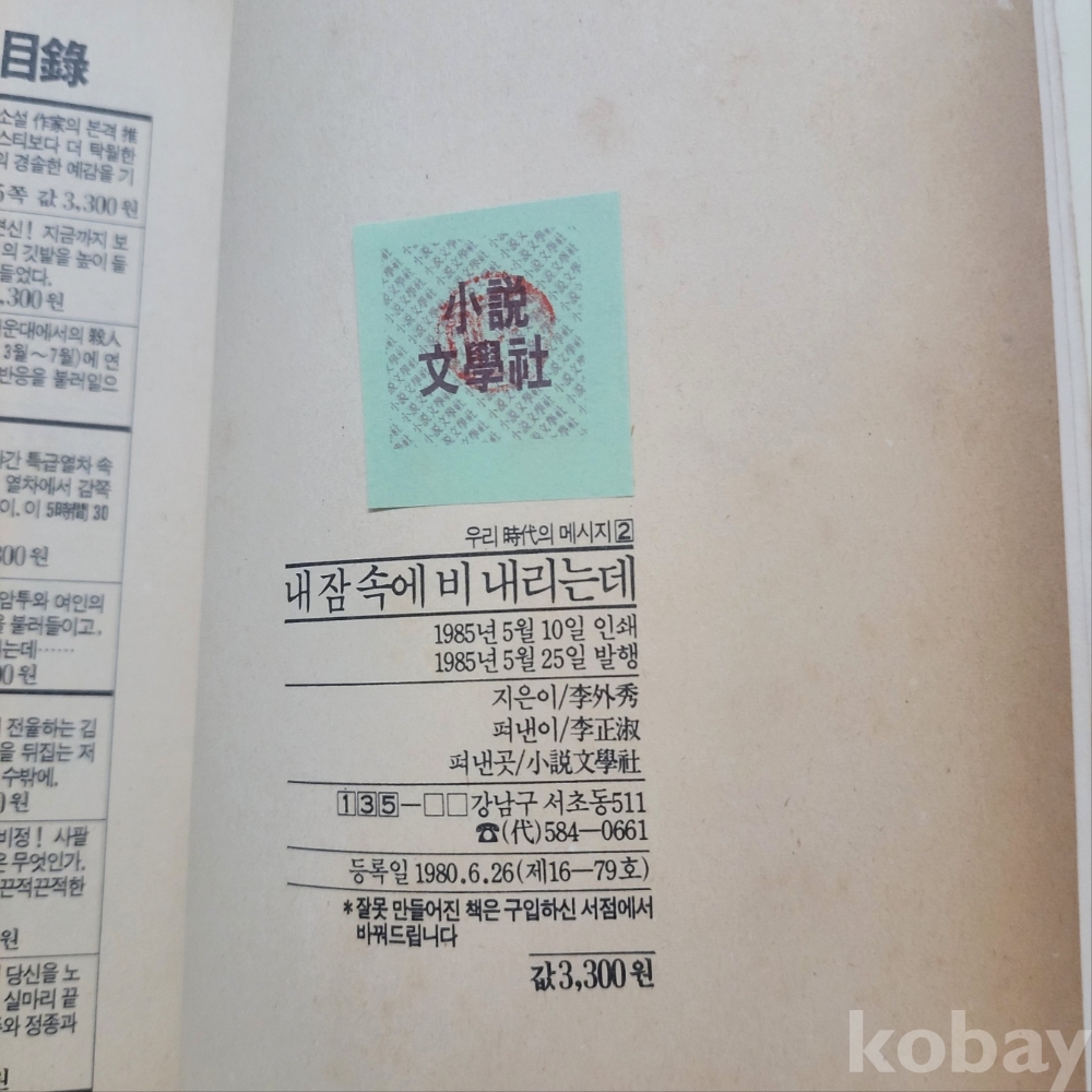 [초판본] 내 잠 속에 비 내리는데 - 李外秀 에세이 / 소설문화사 1985년 초판본 ; 중급/서고T306