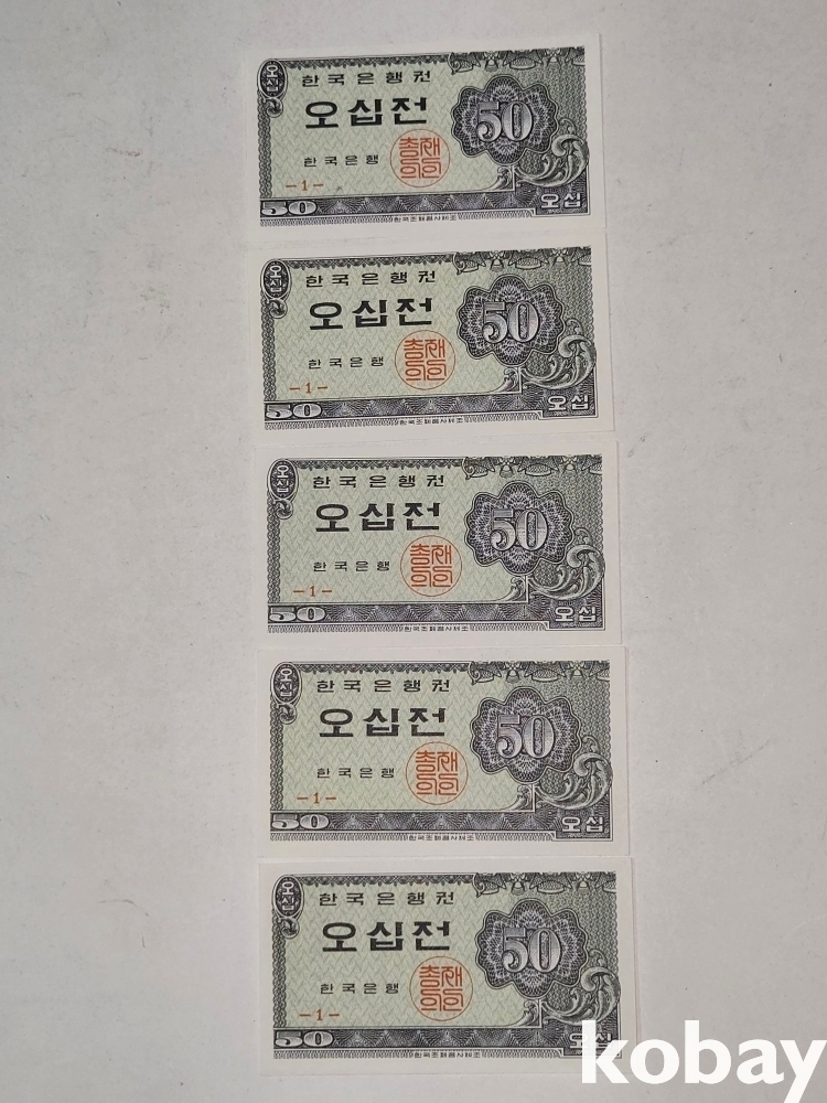 1962년 발행 / 50전 지폐 (완전미사용) 5장 일괄