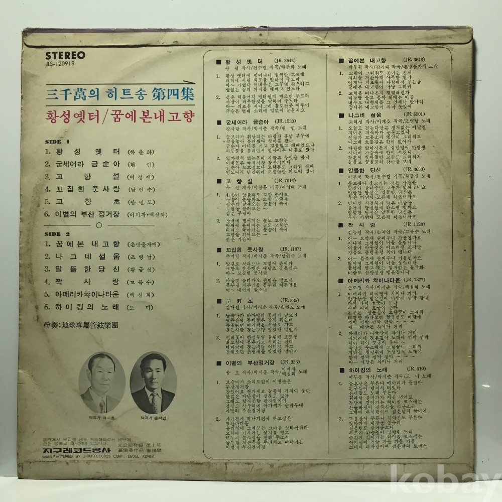 LP 29,300-237 삼천만의 히트송 제4집 - 하춘화 현인 이성애 남인수 은방을 . 74 지구 자켓 EX 알판 EX