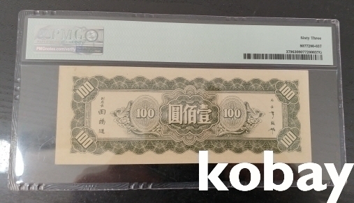 1945년 발행한 일백원의 귀한 지폐 63등급입니다.