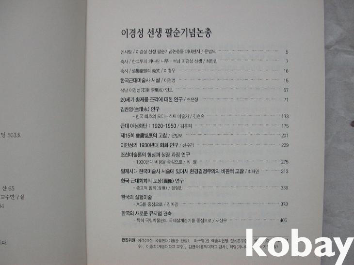 이경성의 <한국근대미술사 서설>이 앞에 실렸으며 <연보>가 있다. 그밖의 논고로 황제릉 조각, 김찬영, 근대 여성화단, 15회 서화협전, 이인성, 조선미술론의 형성, 미술사서술의 식민사관 등에 관한 글들이 참고도판과 함께 실렸다.