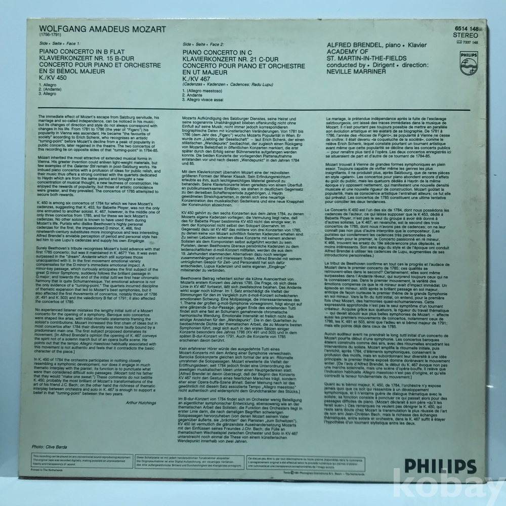 LP 30,900-8 Mozart Klavierkonzart B-dur KV 450 - Neville Marriner . 82 수입 자켓 EX 알판 EX+