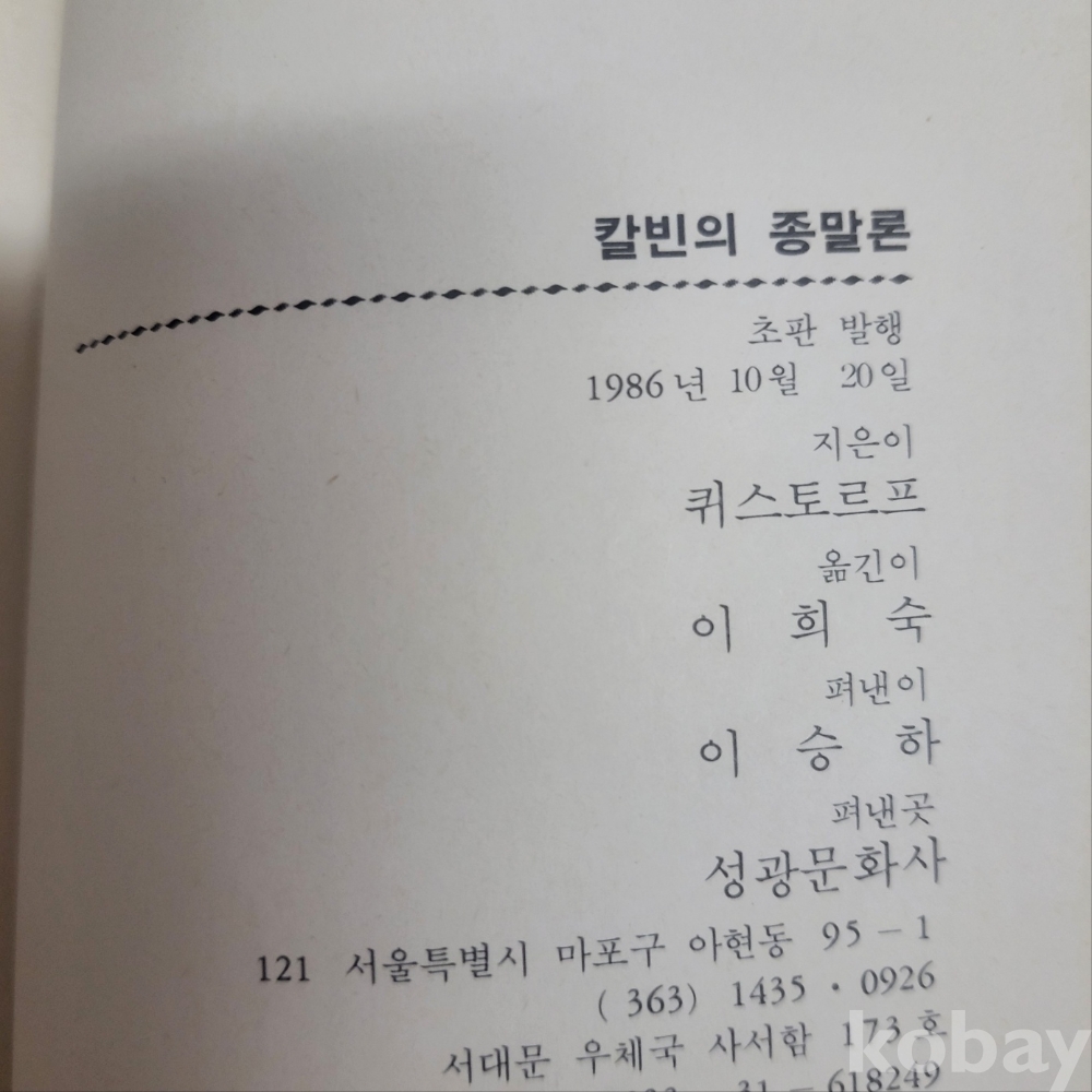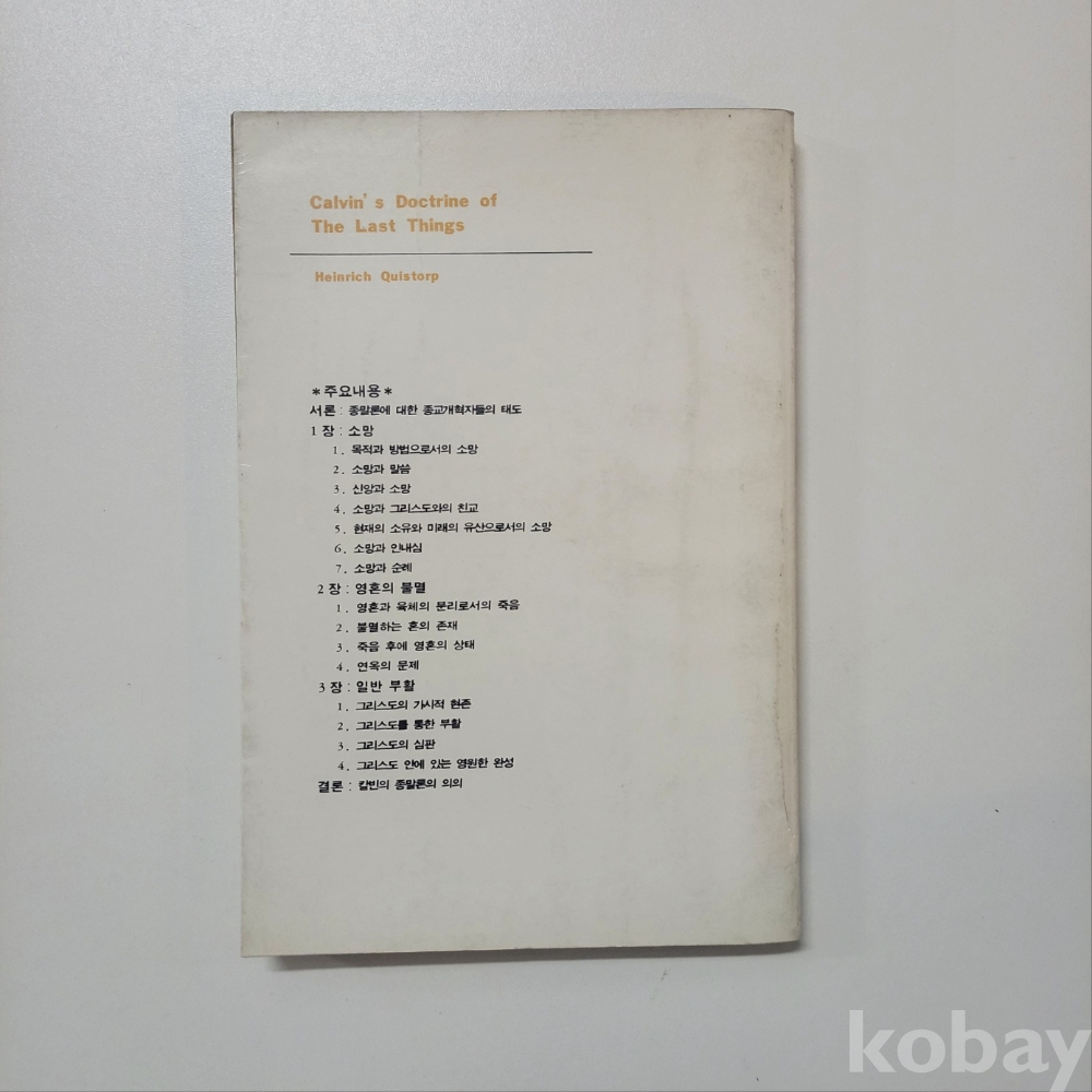 [절판본] 칼빈의 종말론 - H. 퀴스토르프/성광문화사 1986년 초판본 ; 중급/서고T306