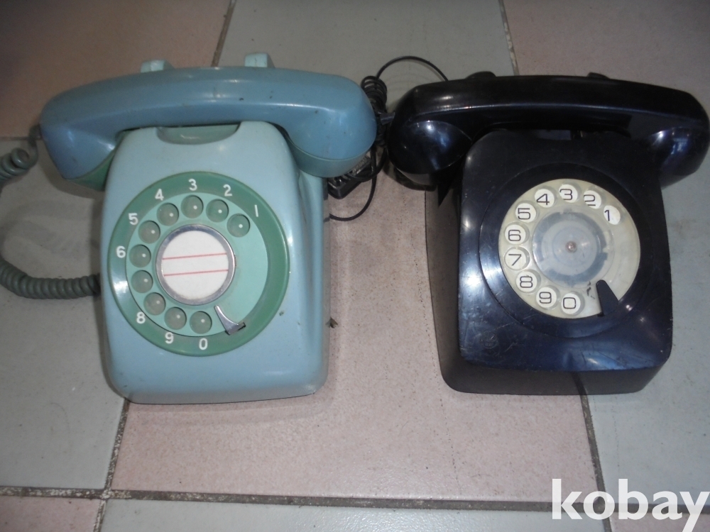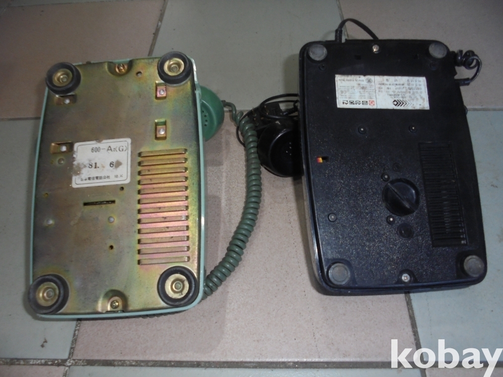 왕관표 금성마크가있는 사용될것으로되는 검은 다이알 금성통신전화기와 무거운 일제 다이알 전화기