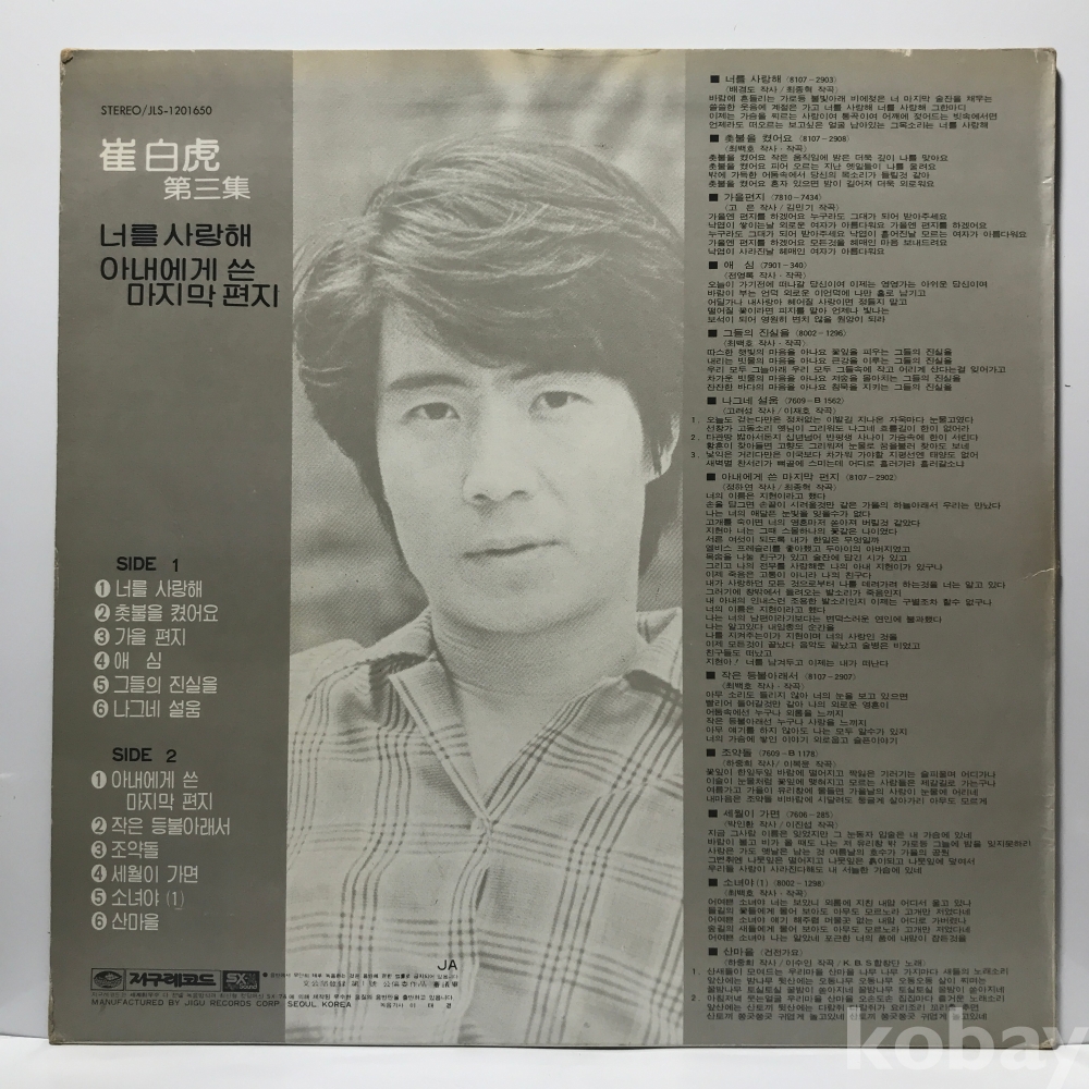 LP 36,800-11 최백호 제3집 - 아내에게 쓴 마지막 편지 . 81 지구 자켓 EX 알판 EX
