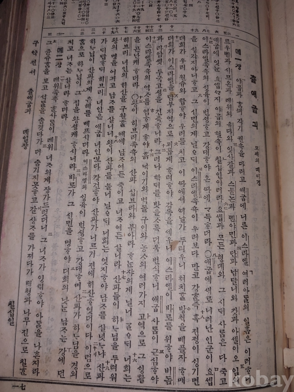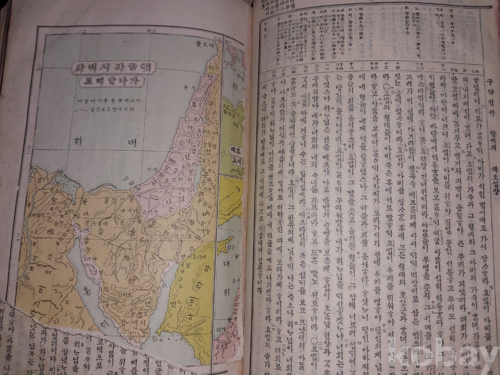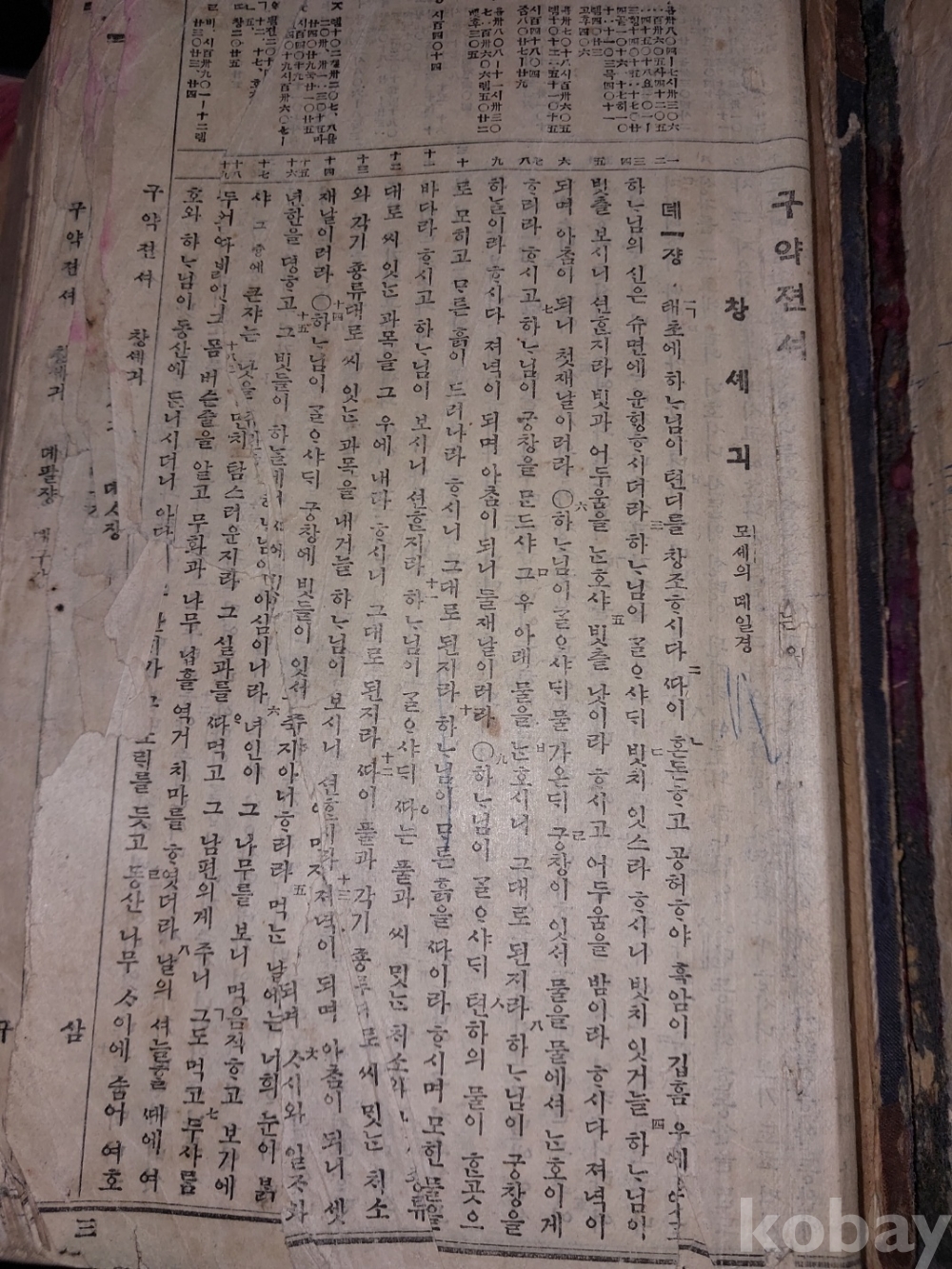 구약젼셔 : 창세긔부터 말나기까지 전책 있지만 창세긔의 첫장 왼쪽 일부 유실되었음. 사진 참조.