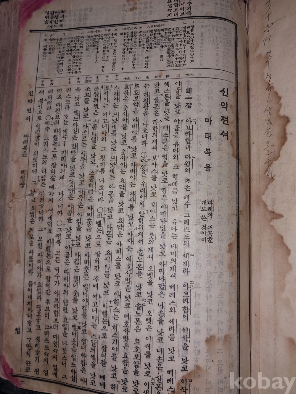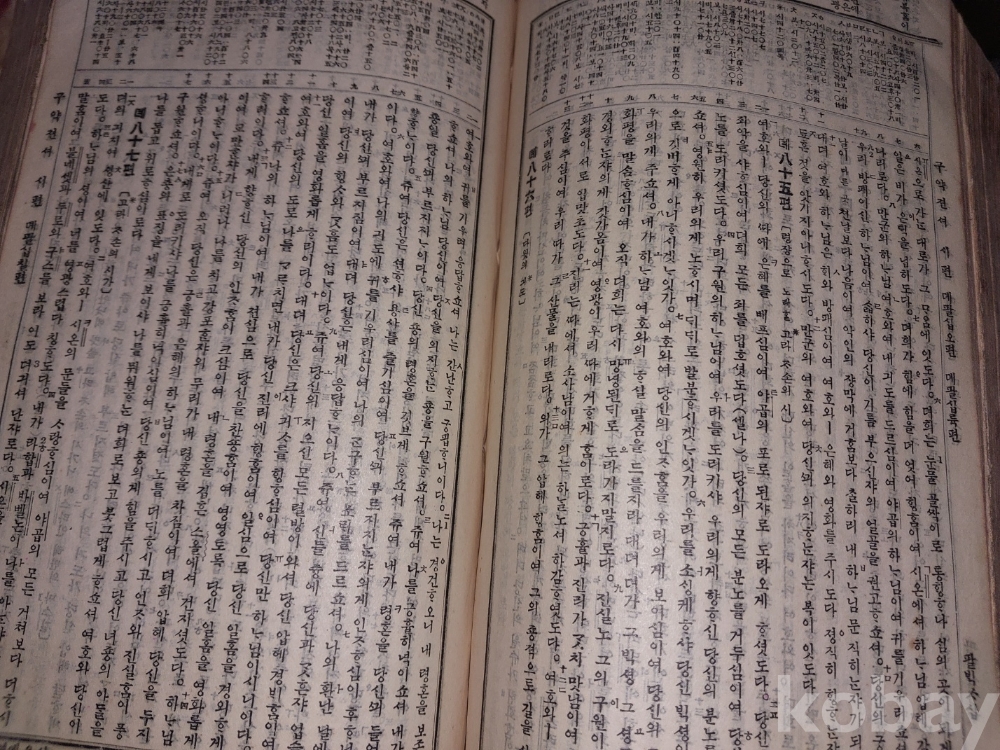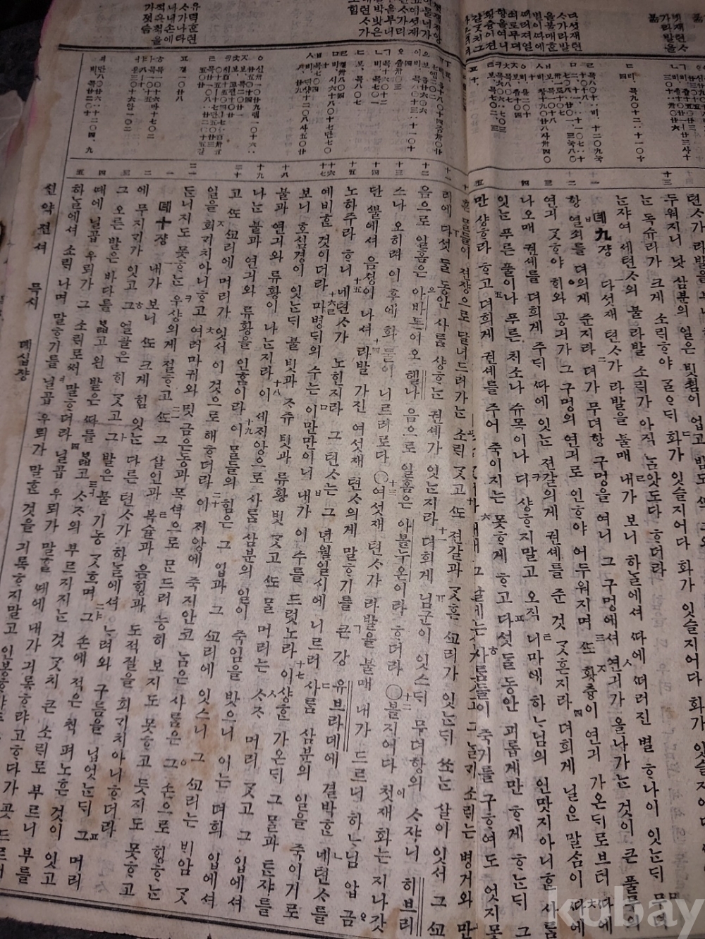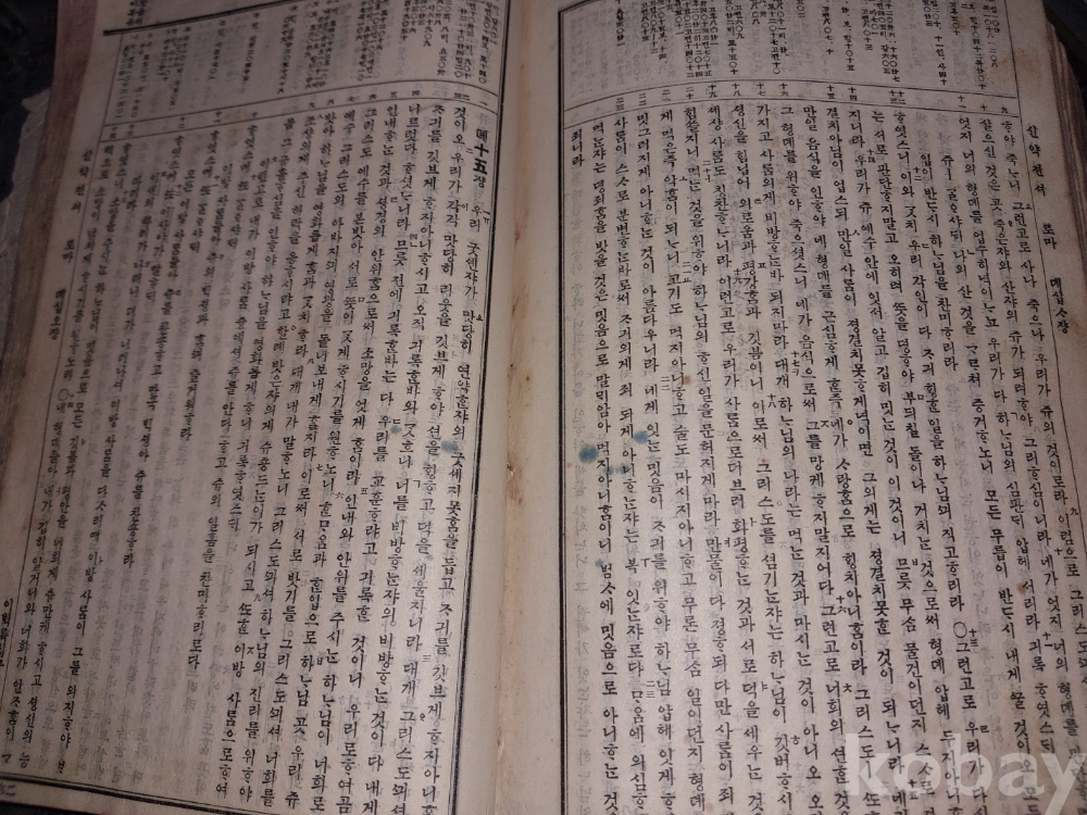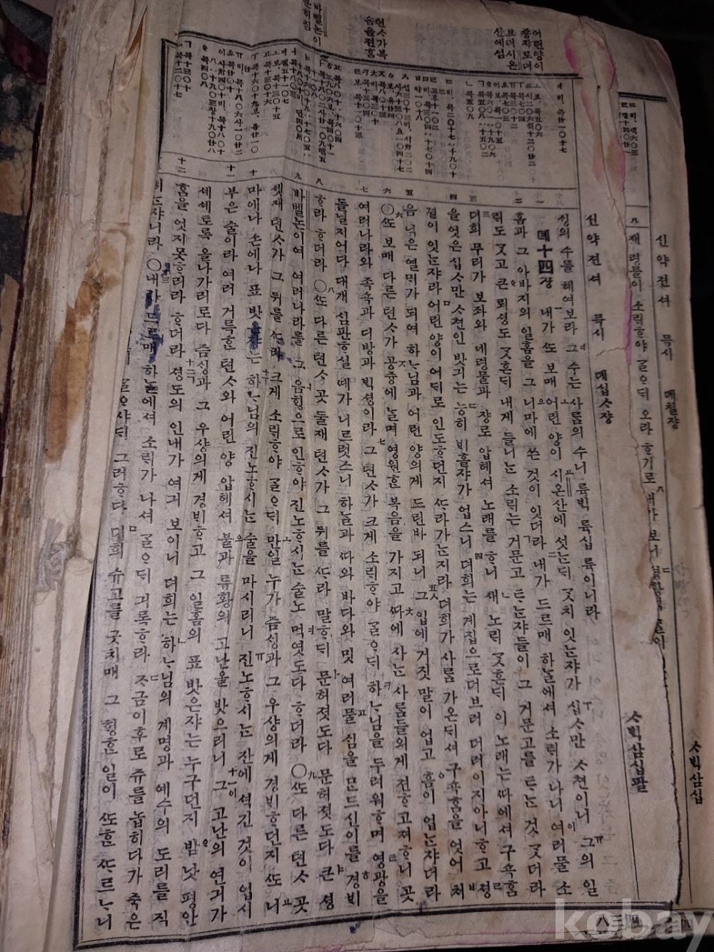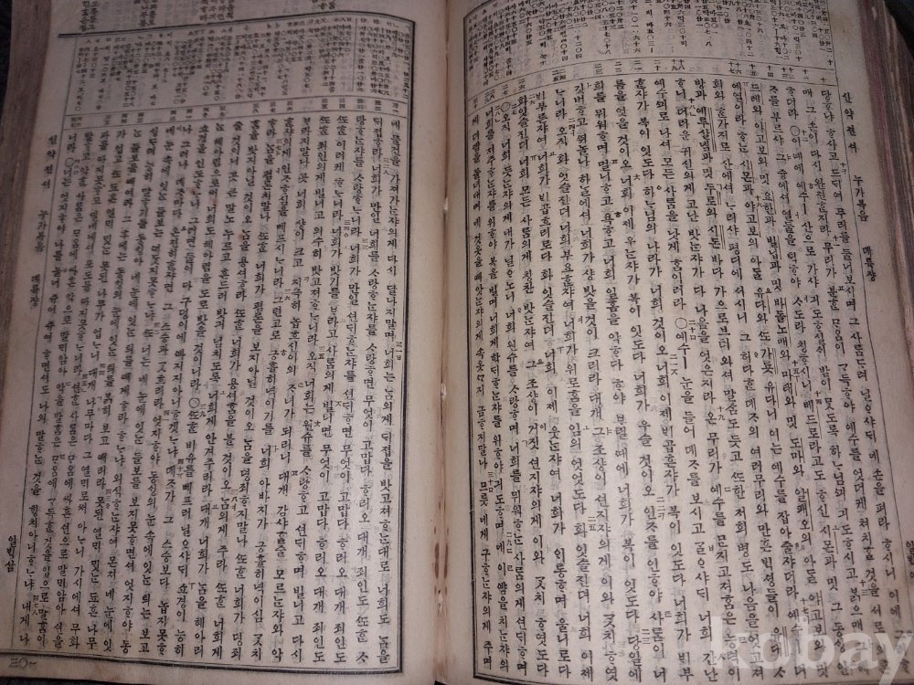 신약젼셔 : 마태복음 1장부터 묵시 14장까지 있음. 묵시록은 요한계시록으로 22장까지 있어야 하는데 나머지는 떨어져 나간 듯싶음. 사진 참조.