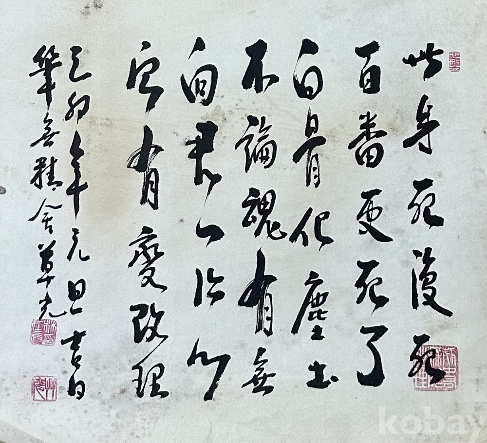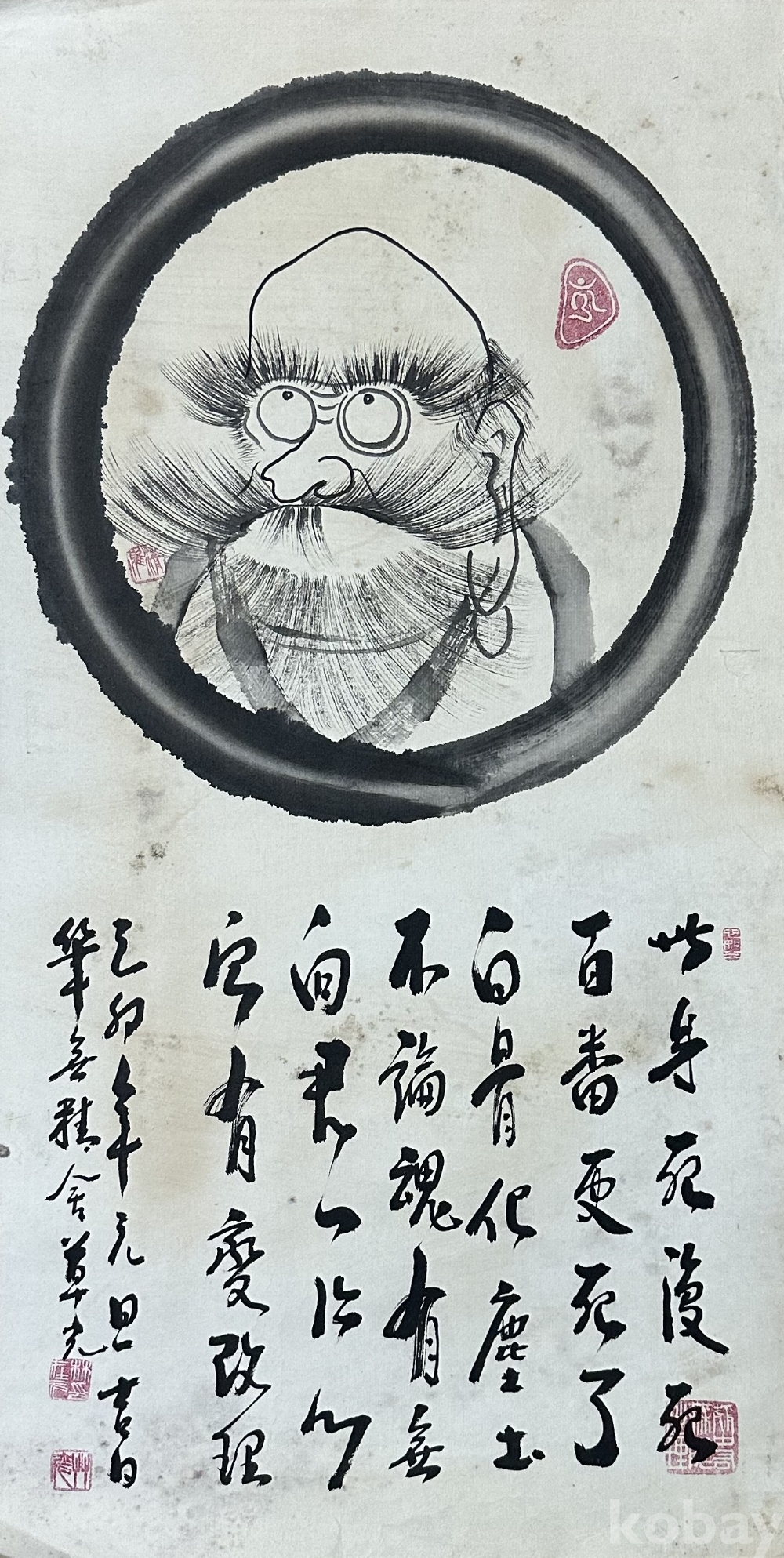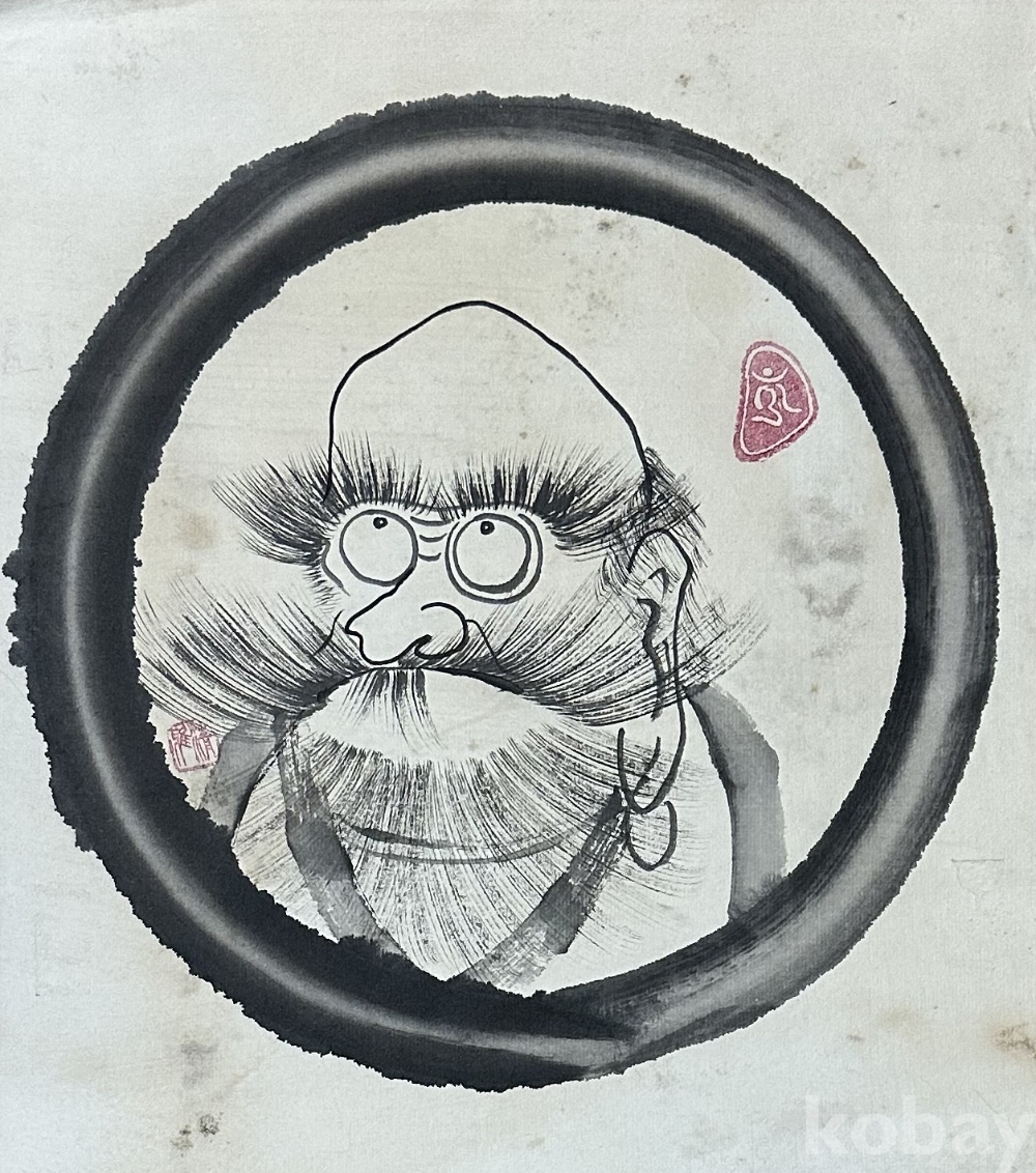 둥근 원 안에 달마를 익살스럽고 개성적인 필치로 표현한 현대 수묵 인물화이다. 거친 붓결과 과장된 눈매가 특징적이며, 작품 하단에는 강한 필력의 문자가 함께 구성되어 전통 서예적 요소와 유머러스한 표현 방식이 조화를 이룬다. 전체적으로 장식성과 개성이 돋보이며 수묵화 수집용으로도 활용 가치가 있다.