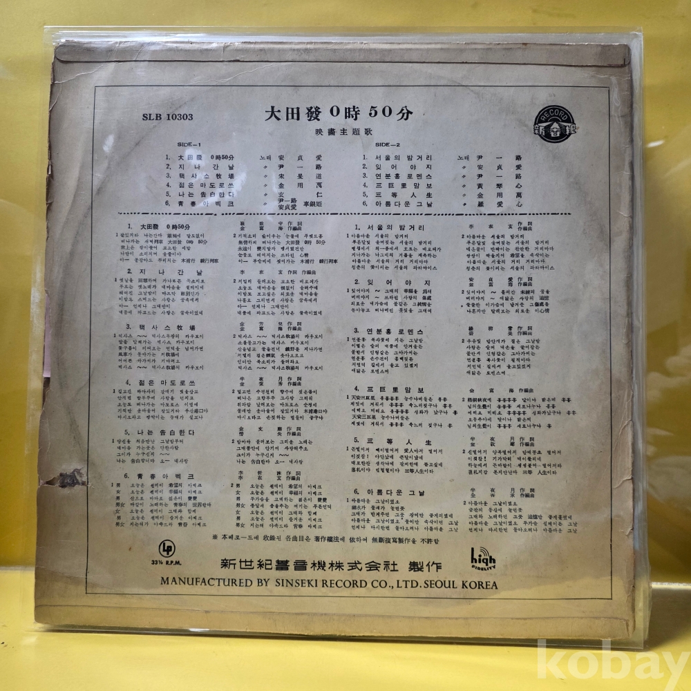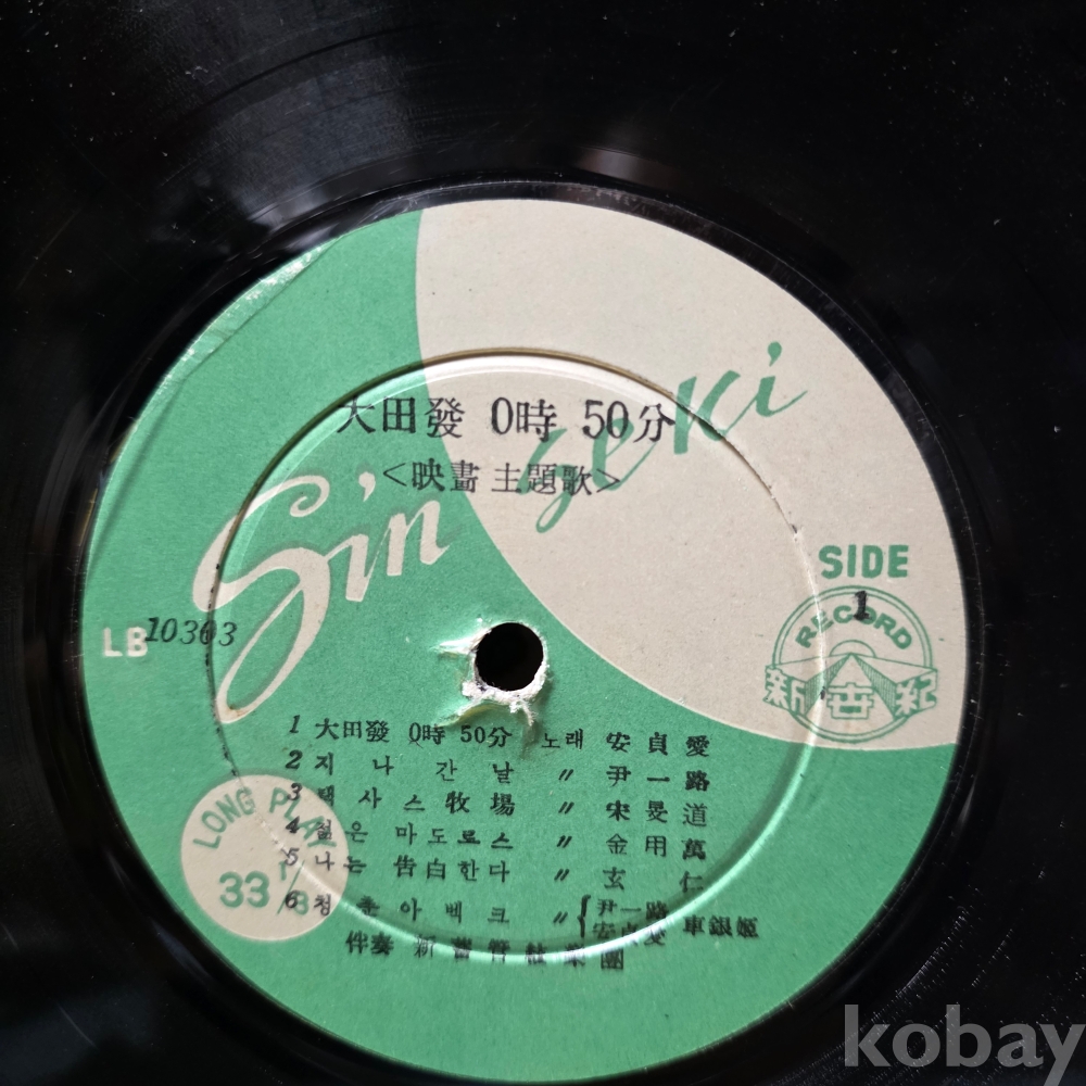 상품 설명 | Side A 1. 대전발 0시50분 (안정애) 2. 지나간 날 (윤일로) 3. 텍사스 목장 (송민도) 4. 젊은 마도로쓰 (김용만) 5. 나는 고백한다 (현인) 6. 청춘 아벡크 (윤일로, 안정애, 차은희) Side B 1. 서울의 밤거리 (윤일로) 2. 잊어야지 (안정애) 3. 연분홍 로멘스 (윤일로) 4. 삼거리 맘보 (황금심) 5. 3등 인생 (김용만) 6. 아름다운 그 (나애심) |