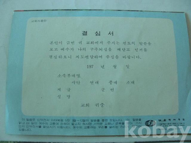 군부대 교회 - 결심서 (4매일괄, 1970년대)