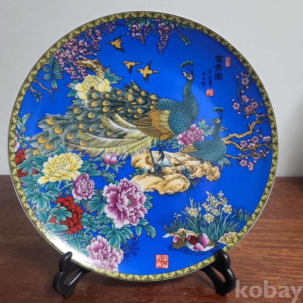 그림이 화려하게 전사된 도자기 접시입니다. 미사용 작품으로 좌대와 함께 제공되며 사이즈와 무게 모두 장식용으로 두고 보시기에 손색없는 작품입니다