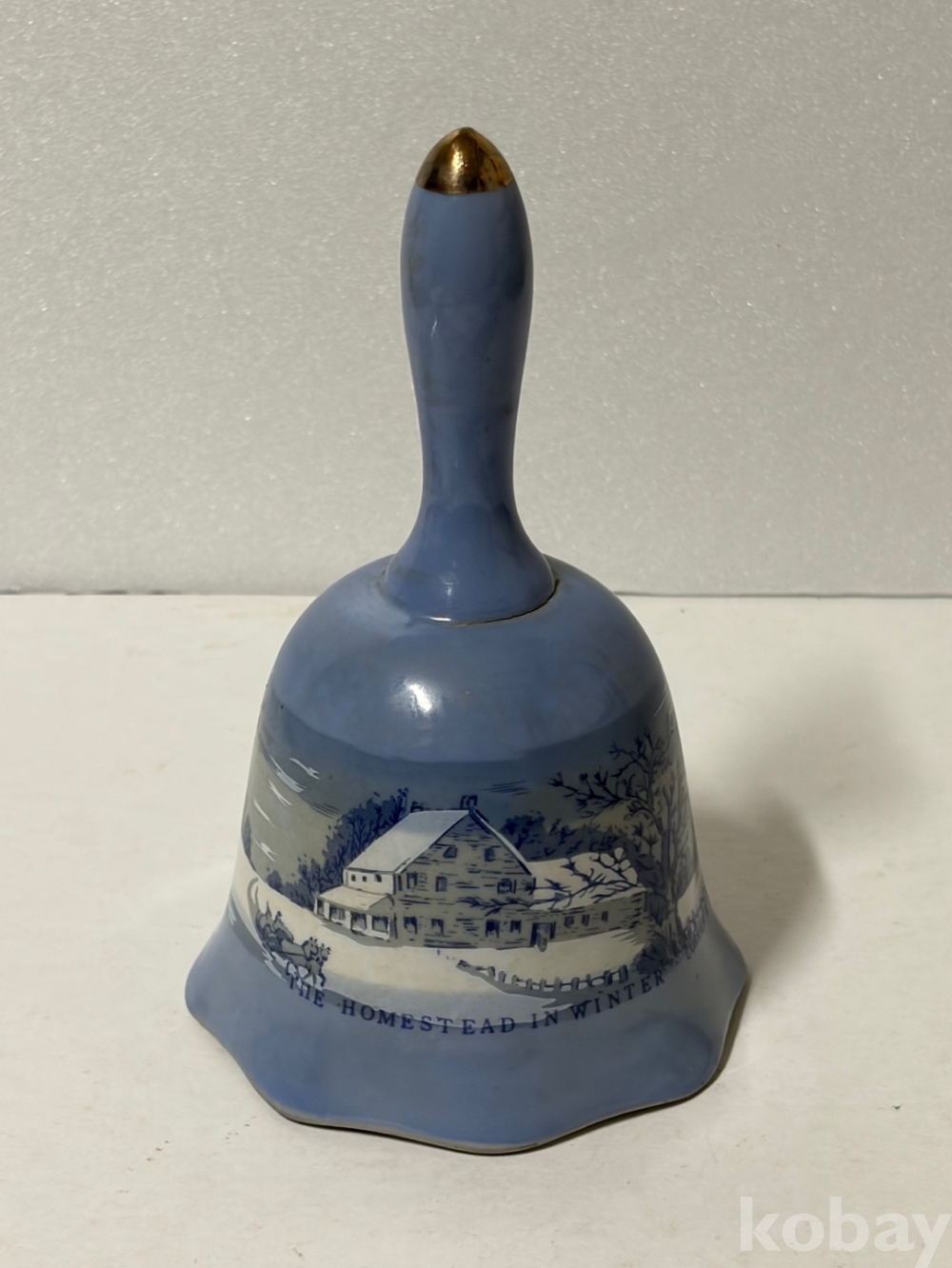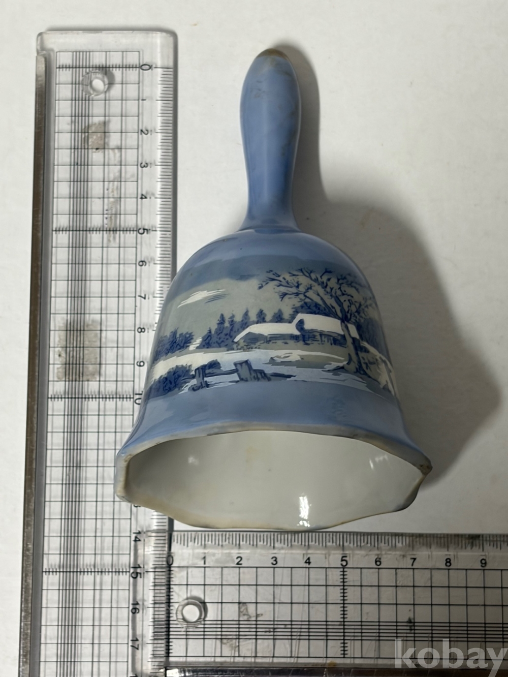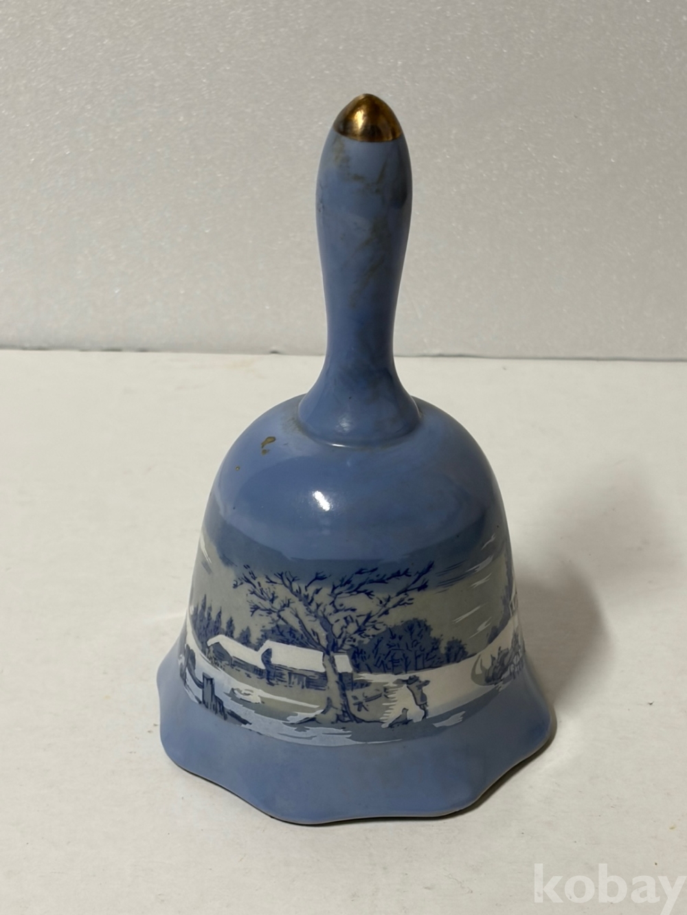 눈 덮인 풍경, 집, 나무, 썰매나 동물이 포함된 겨울 장면이 그려져 있는 도자기 종입니다.