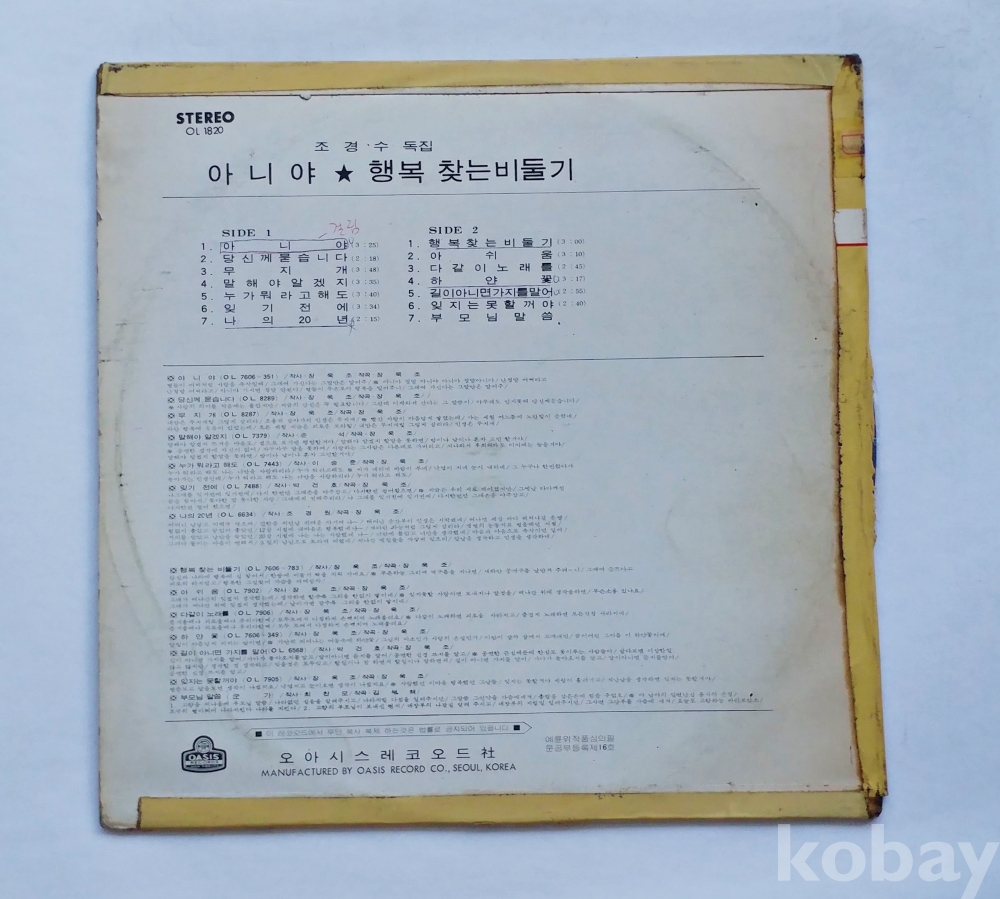 | 자켓상태 | EX : 약간의 마모, 모서리 찢김 존재 | 음반상태 | EX : 재생에 영향 없는 가벼운 기스 존재 | 발매정보 | 알수없음 | 가사지여부 | 무 |