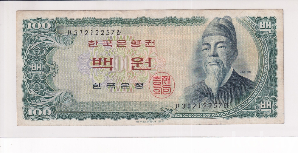 - 한국은행 1965년 세종 백원 사용제 지폐