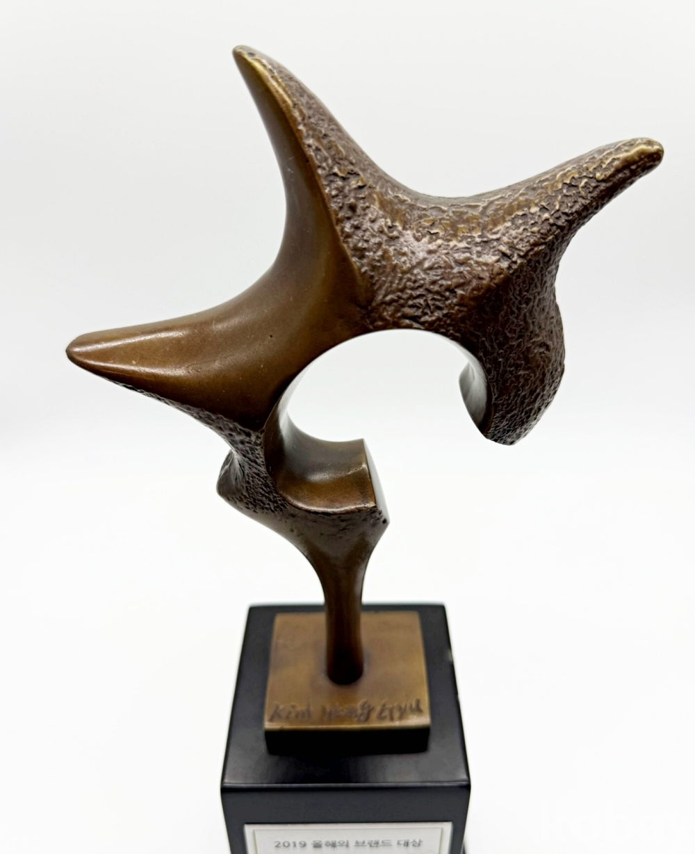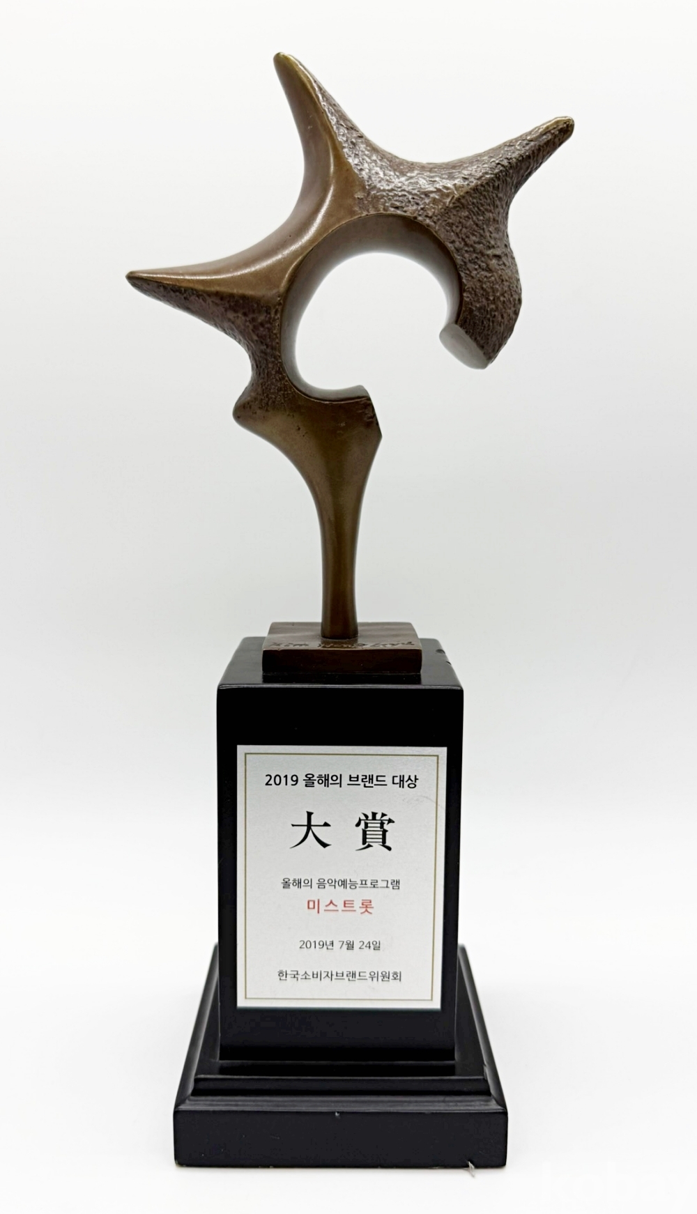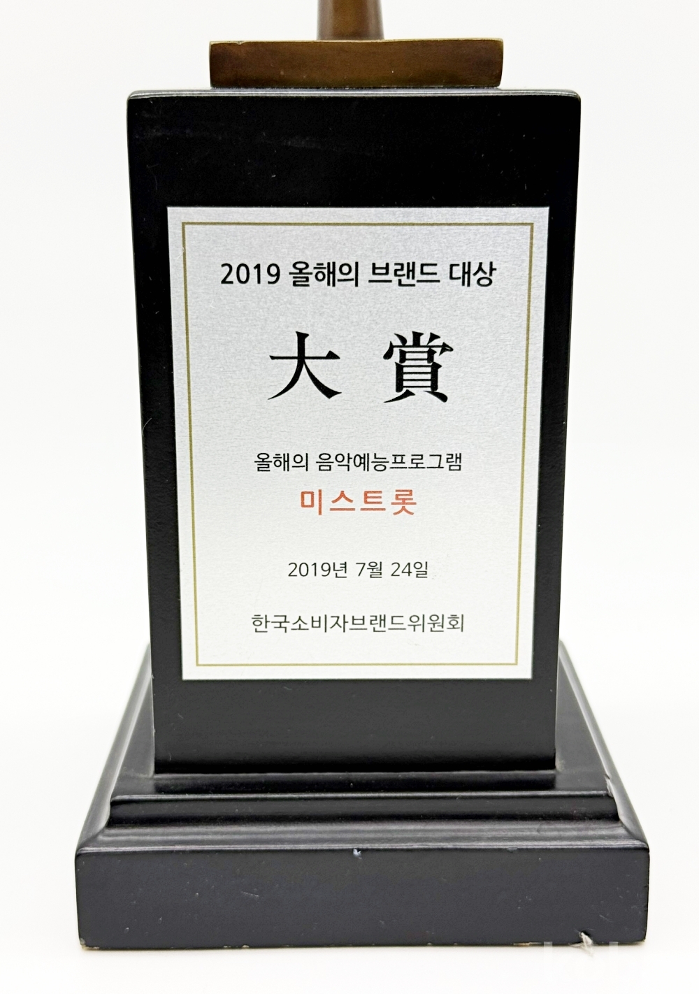 소비자가 직접 한 해를 빛낸 브랜드를 선정하는 브랜드 어워즈인 '올해의 브랜드 대상'에서 2019년 TV 프로그램 <미스트롯>이 올해의 음악 예능 프로그램 대상을 수상하며 받은 트로피이다. | ||