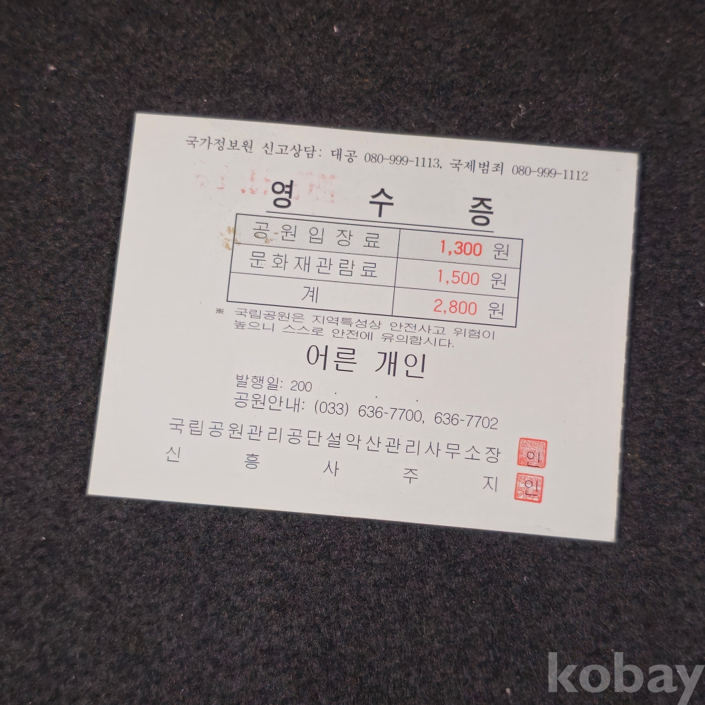 (((근현대사자료))) 오래전 설악산 공원입장료 영수증 (0765590)