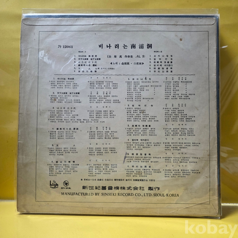 상품 설명 | Side A 1. 비나리는 남포동 2. 천하대장군 지하여장군 3. 나그네 이십대 4. 월남에서 온 편지 5. 여인 6. 부산의 연정 Side B 1. 쾨지나칭칭 2. 범벅타령 3. 고향의 옛친구 4. 밤비에 내가 운다 5. 명동뒷골목 6. 우리는 동창 |