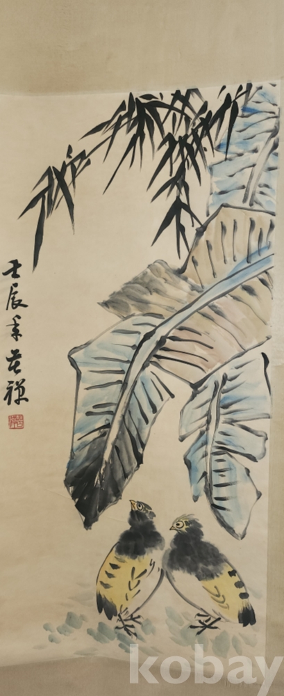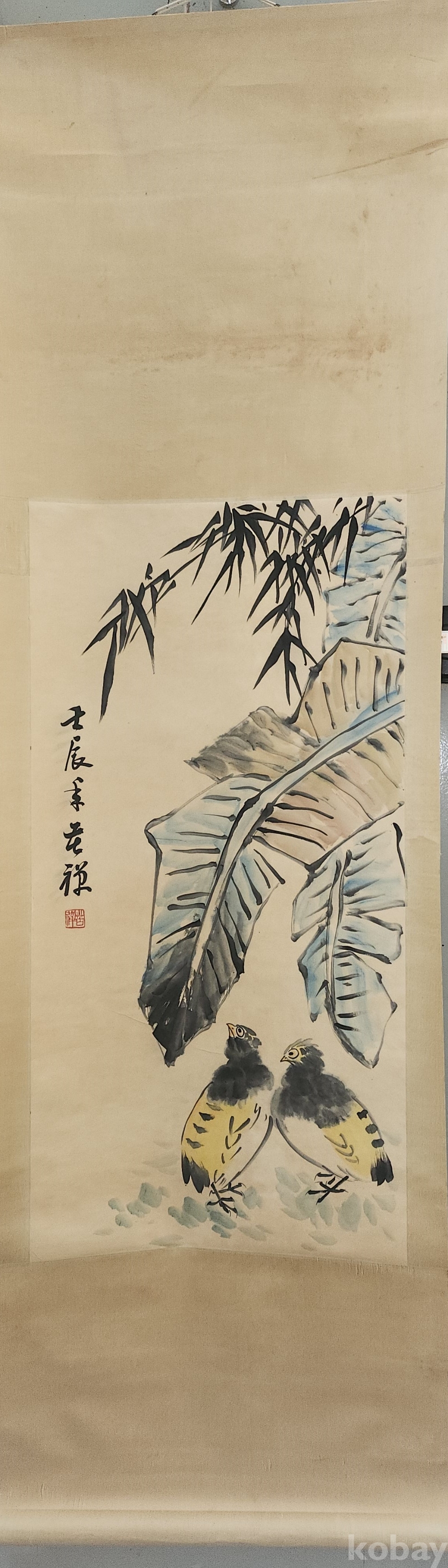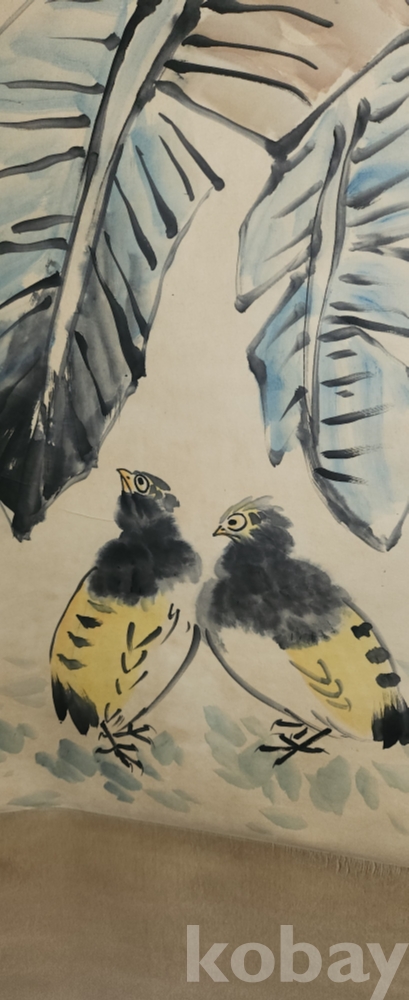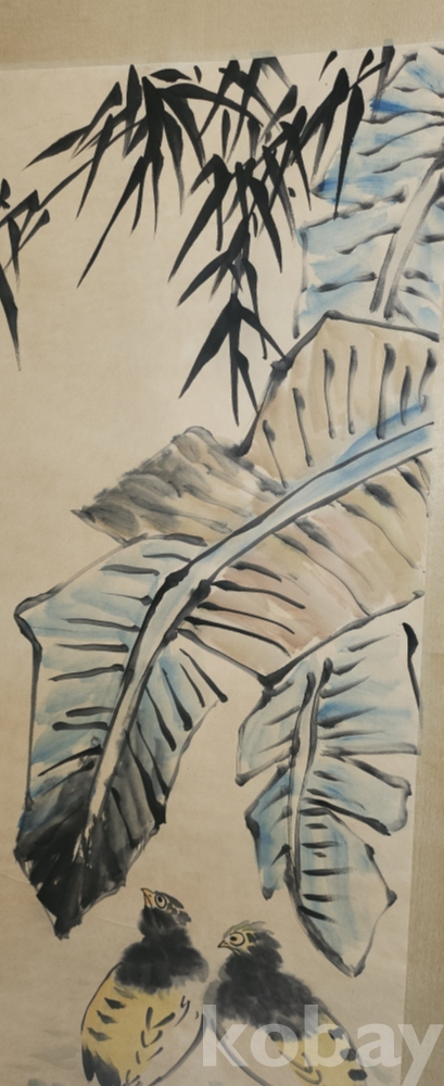 중국화가 고선 수결이 보이는 비파잎과 새그림 큰 족자입니다,