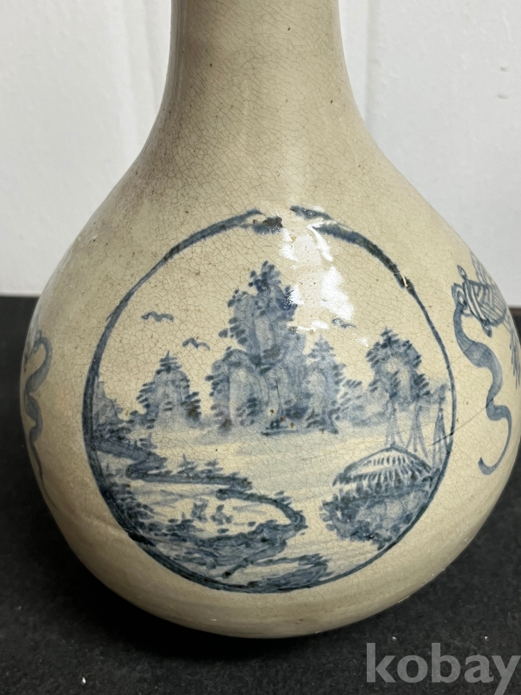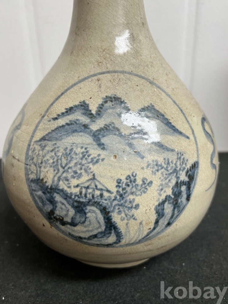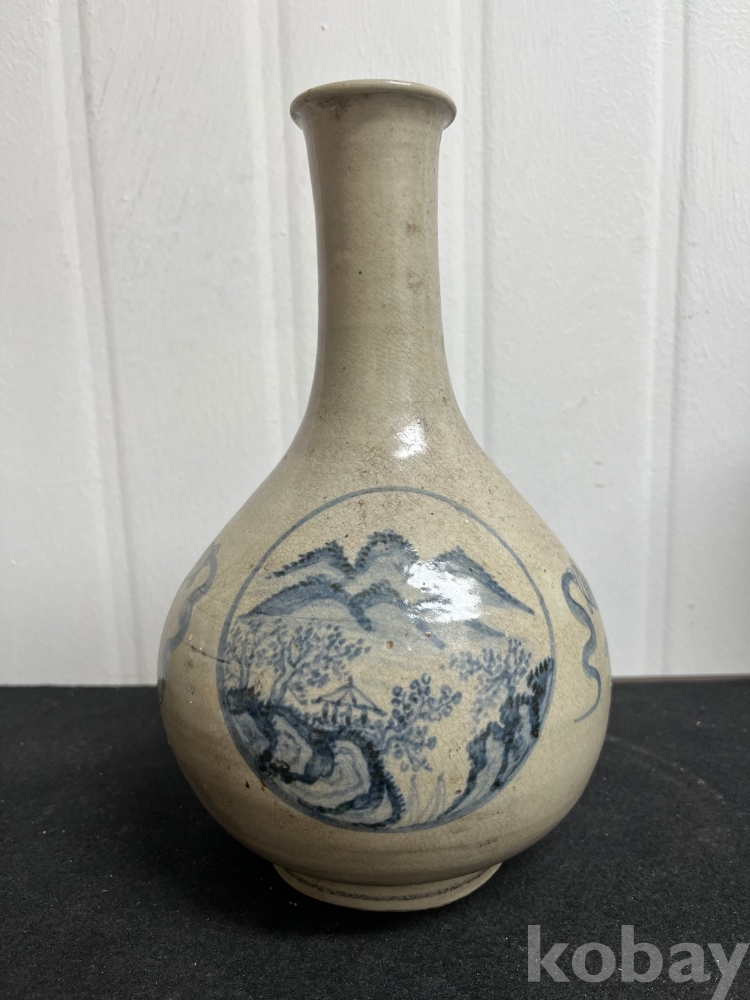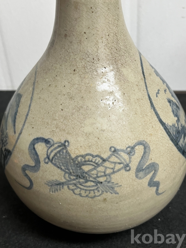 백자의 태토 위에 청화안료로 산수문과 길상문을 장식한 도자기입니다.