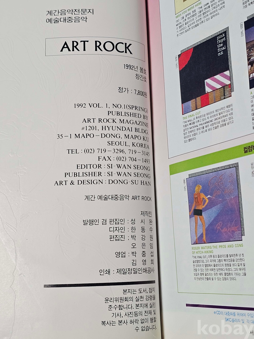 물 품 명 | [창간호] 예술대중음악 Art Rock / 1992년 봄호 / 통권 제1호 / 아트락매거진 |