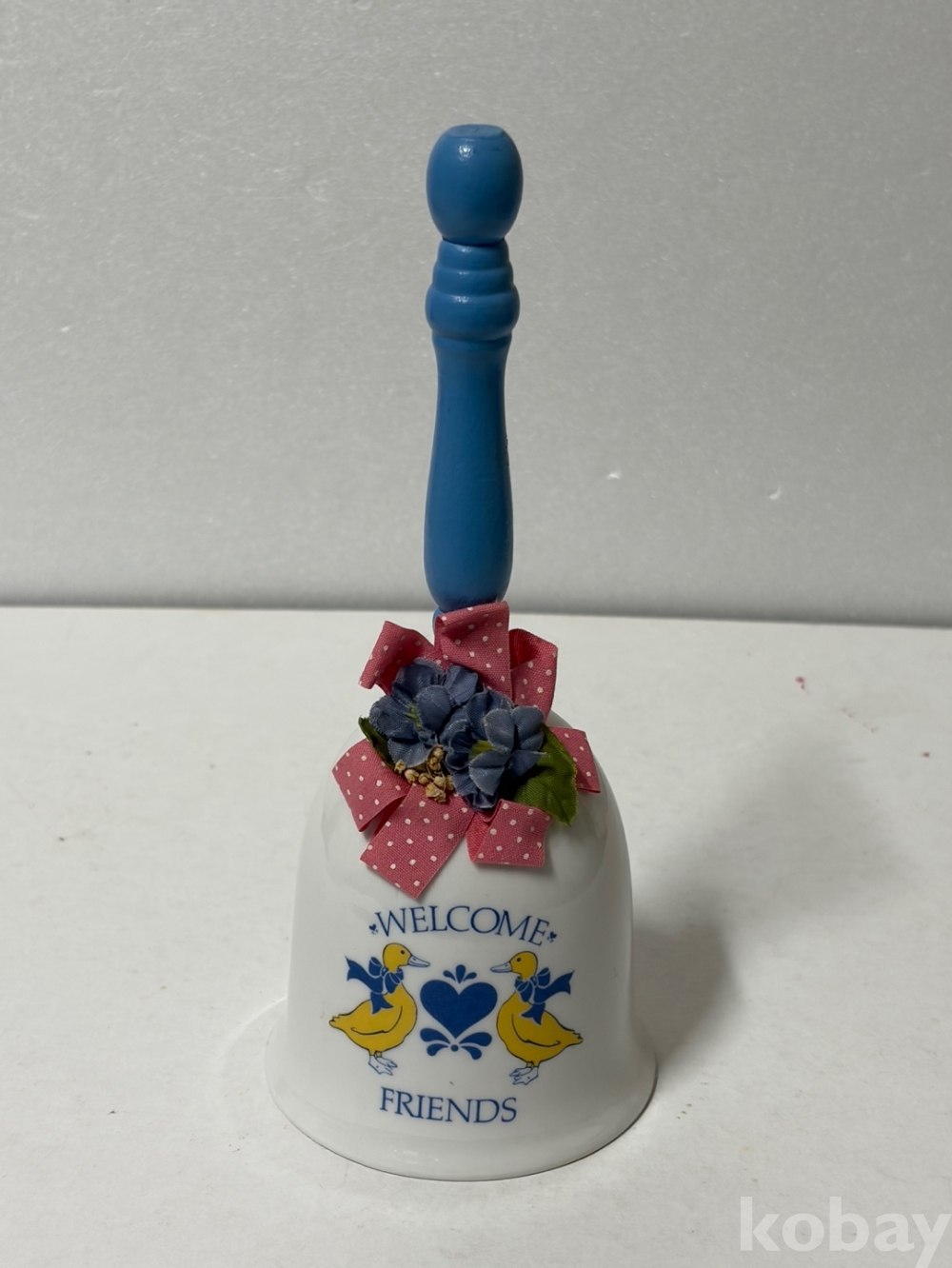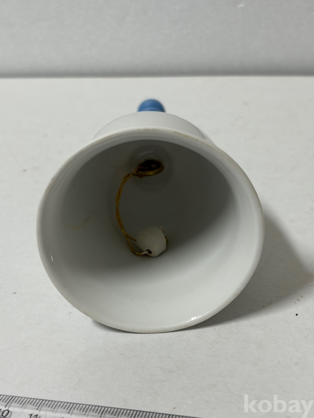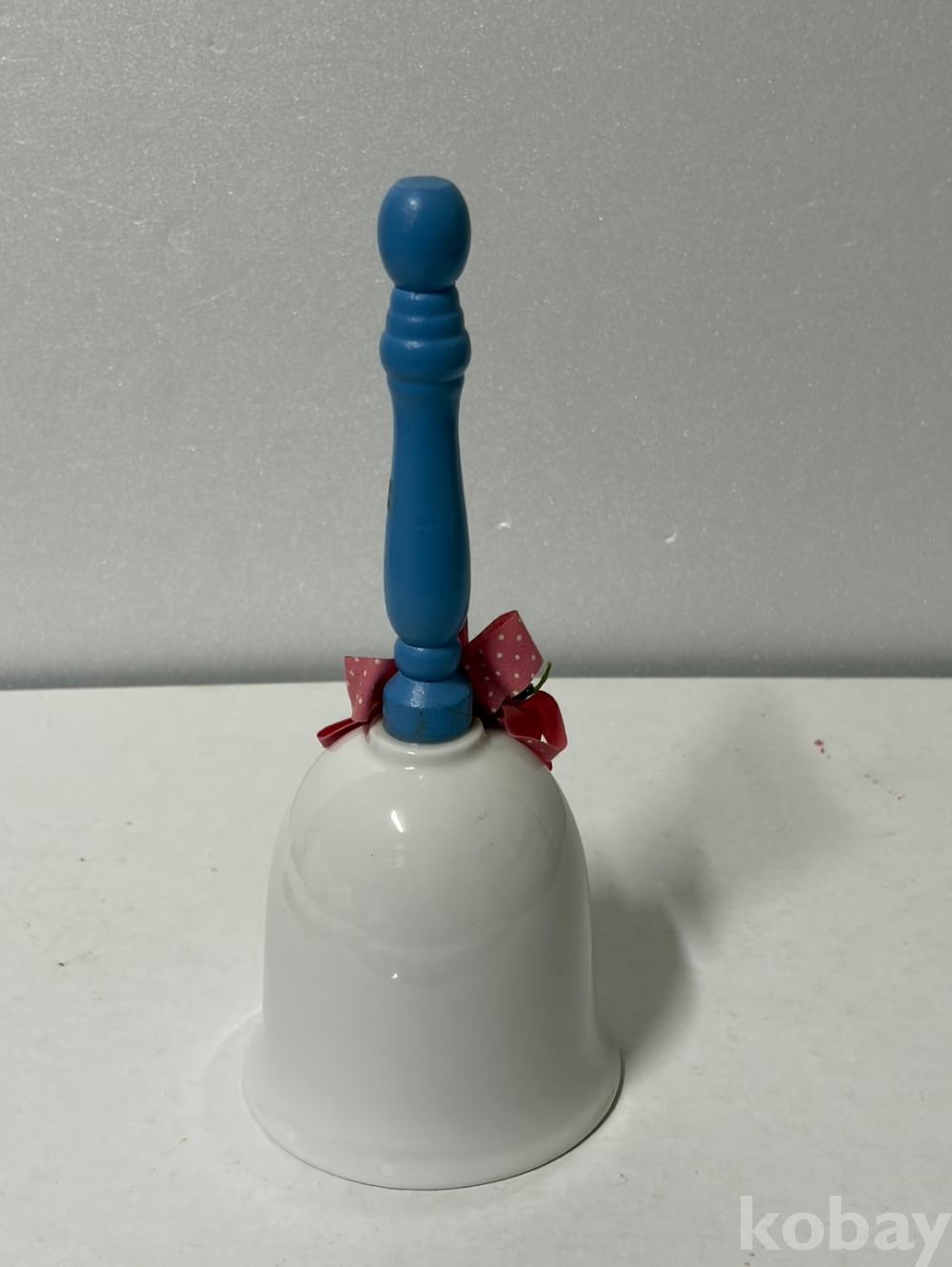 파란색 손잡이가 달린 도자기 종입니다.
