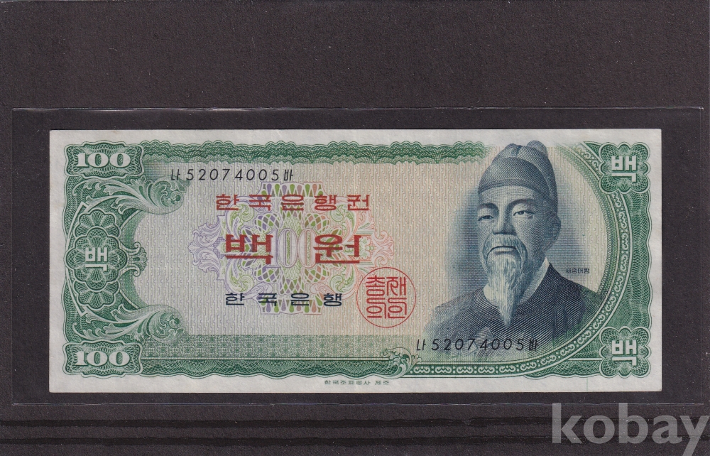 - 한국은행 1965년 세종 백원 줄세우기 52포인트 극미 사용제 지폐