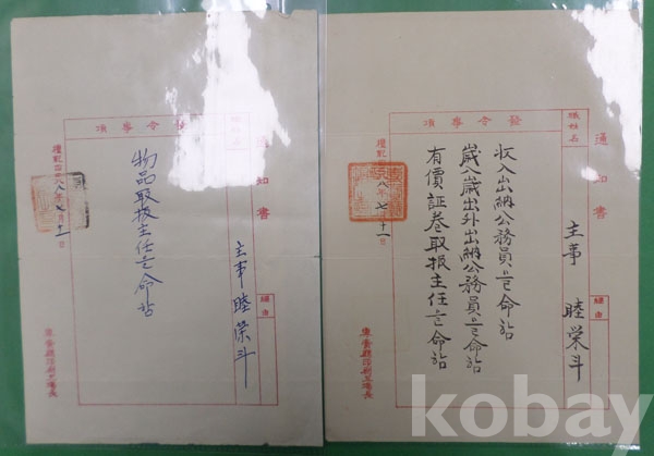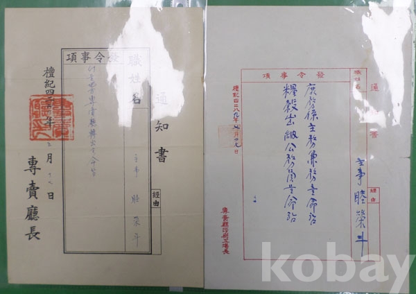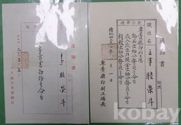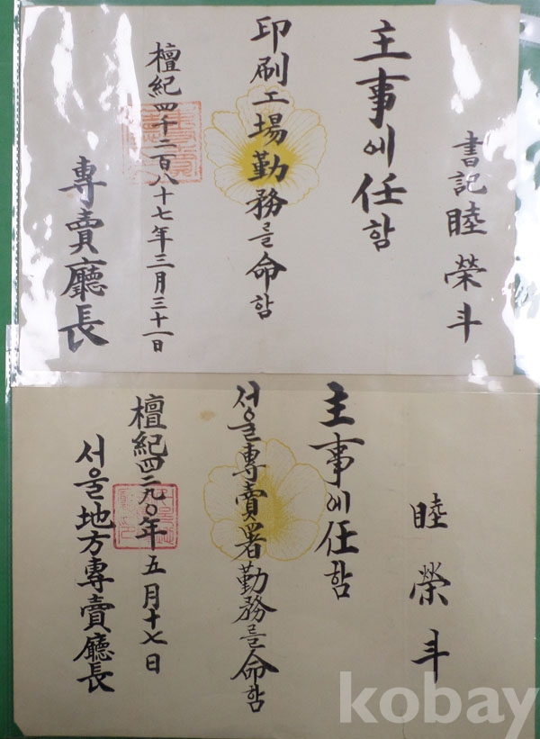 [6] 1955년 전매청인쇄공장 발령통지서 2부 (전매청인쇄공장장)