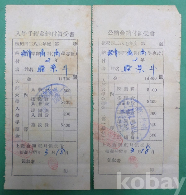 [3] 1954년 대구대학 입학수속금납부영수서