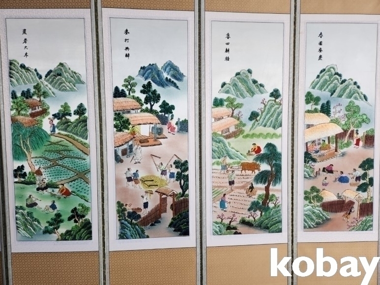 전통 풍속의 모습을 자수로 표현한 8폭 병풍 입니다.