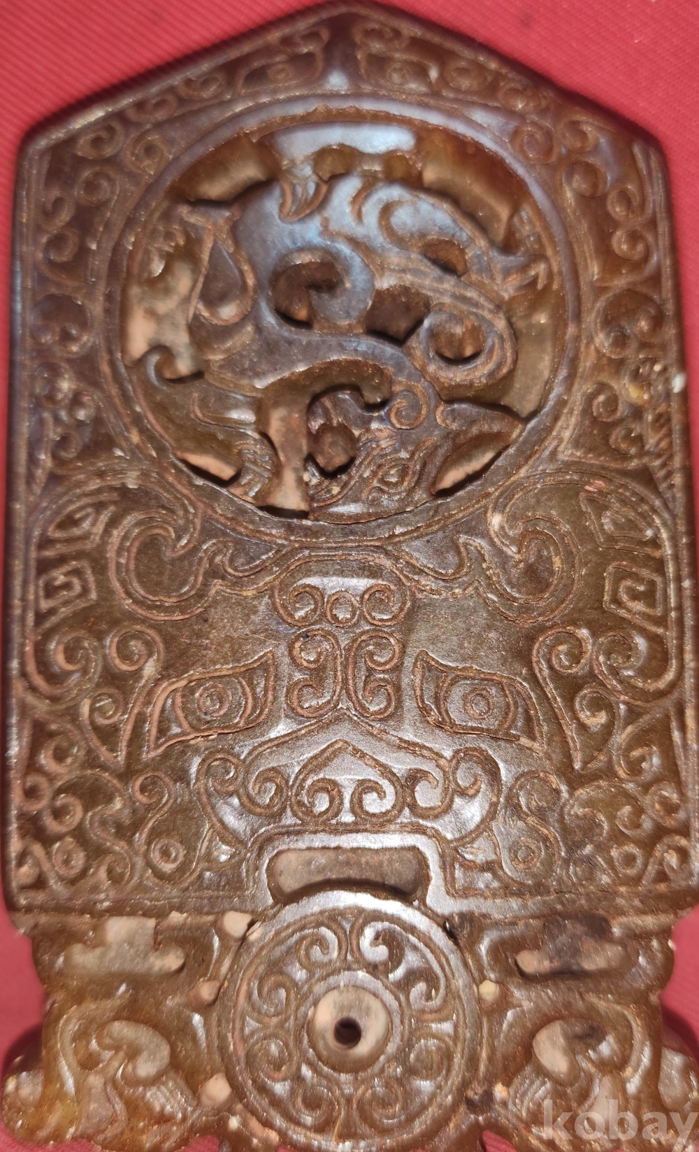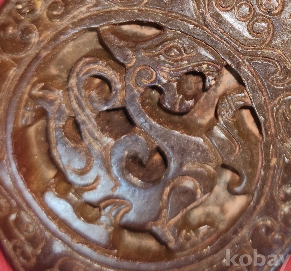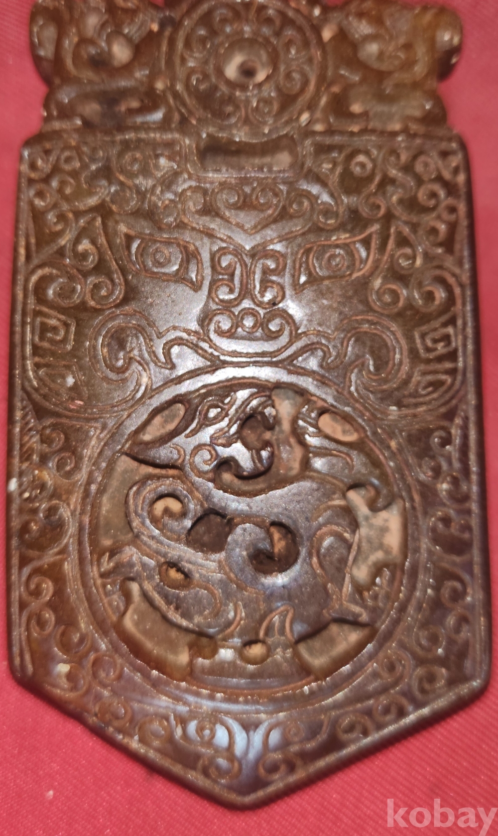 전면에는 투각 용문양이 투각으로 자리하고 상단부에응 구멍이 있어서 실을 꿰어 팬던트로 사용 할 수 있는 기능입니다,